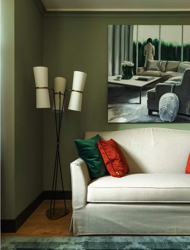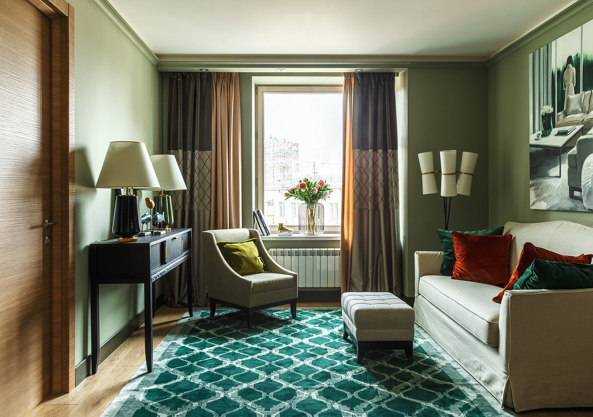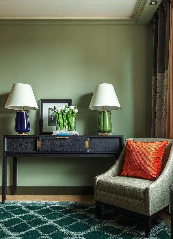 В гостиной декоратор отказалась от люстры, заменив ее скрытой подсветкой по периметру. “Не все любят этот прием, но он помогает экономить объем помещения”, – говорит она. Любимые хозяйкой яркие зеленый и оранжевый присутствуют в квартире в виде акцентов. А основной фон мягче и одновременно сложнее. “Открытые цвета “съедают” пространство, а приглушенные выглядят более элегантно”, – считает Екатерина. Ни одному из использованных в квартире оттенков невозможно дать точное определение, настолько они изменчивы. При этом все они еще холодные – это, как объясняет Екатерина, тоже способ зрительно расширить пространство.