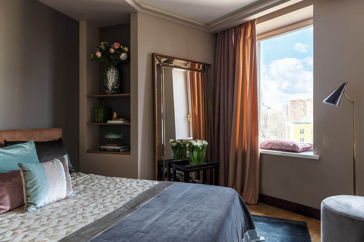 Проект декоратора Екатерины Поповой, которая на 48 квадратных метрах квартиры смогла грамотно организовать пространство под большую гардеробную, кухню и гостиную максимально правильной формы. Самой кривой получилась спальня, но Екатерина успешно скрыла этот факт с помощью дизайнерских хитростей: устроила сбоку от кровати нишу с полками, нелепый короб у окна спрятала за зеркалом и смягчила пространство тканями.