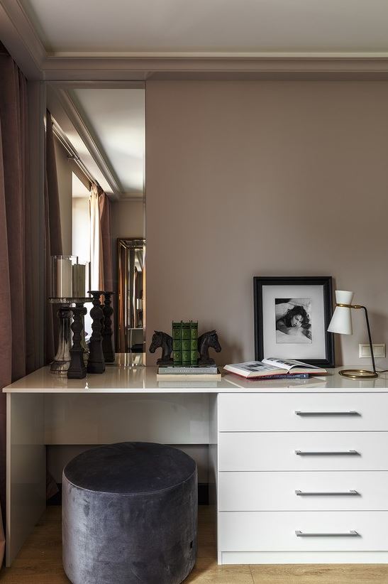 Стол мы сделали из высоко-глянцевых панелей, ящики с доводчиками, использовали только немецкую фурнитуру. Выглядит просто, эффектно и лаконично. В таком интерьере добавляет нотку воздушности.