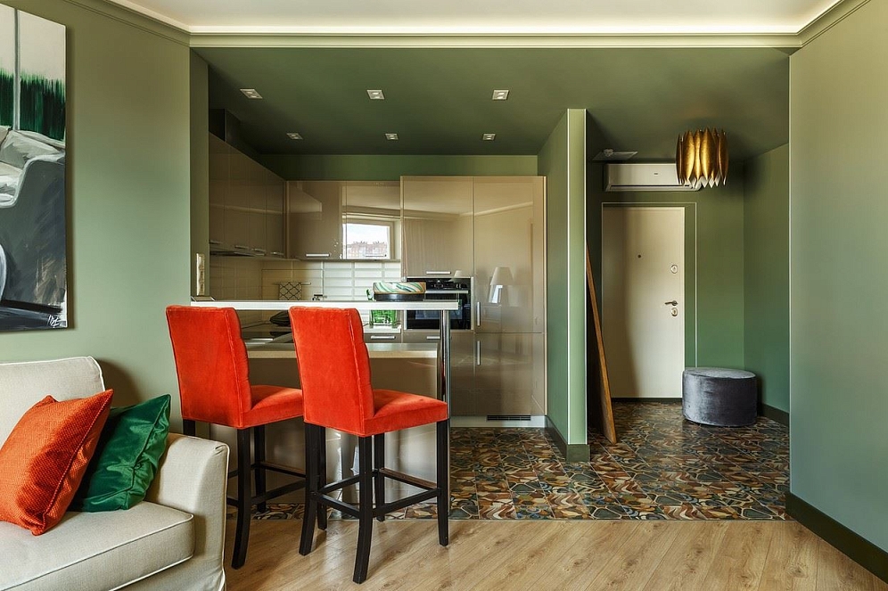 Еще одна маленькая, но важная победа была одержана в зоне прихожей и кухни. Потолки в квартире и так невысокие, а здесь из-за коммуникаций их пришлось понизить до 2,3 м. Попова использовала хорошо известный прием – покрасила их в тот же цвет, что и стены. Это отвлекает внимание от стыка двух поверхностей, помещение кажется выше. К тому же переход из более низкого и темного пространства в помещение повыше и посветлее делает интерьер более сложным и зрительно более просторным.