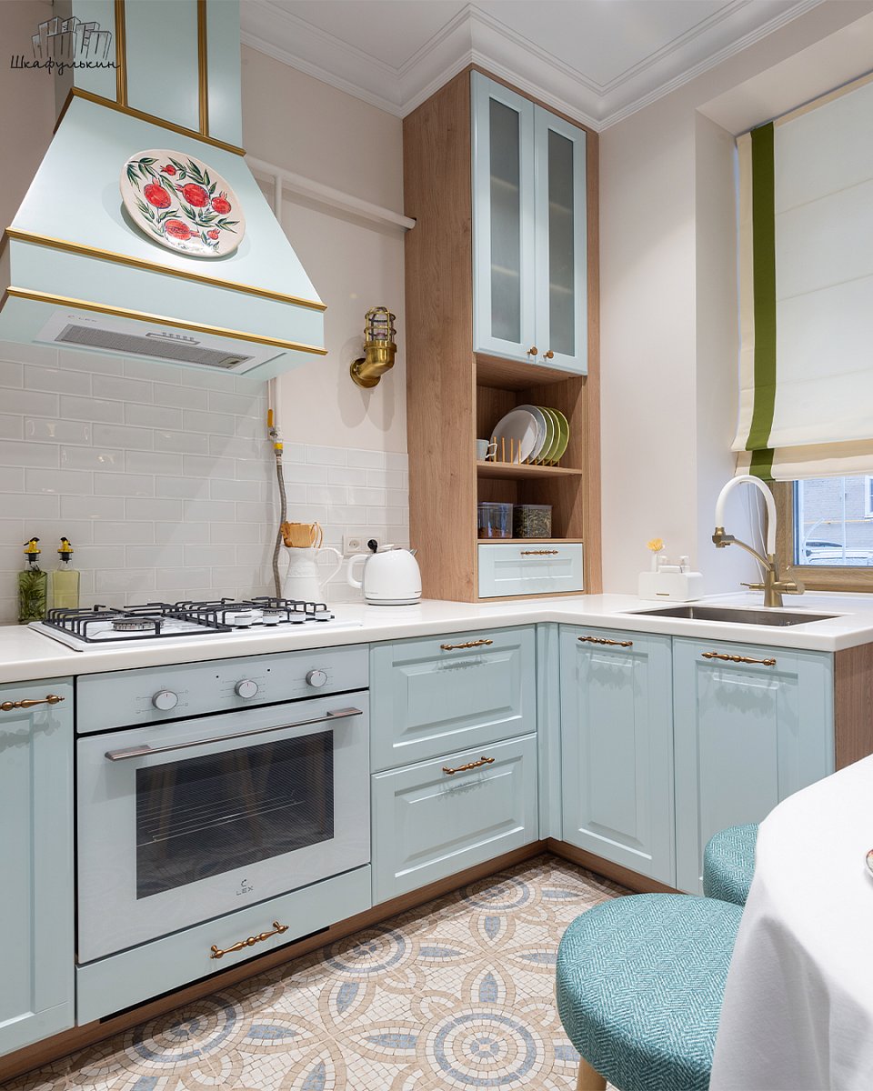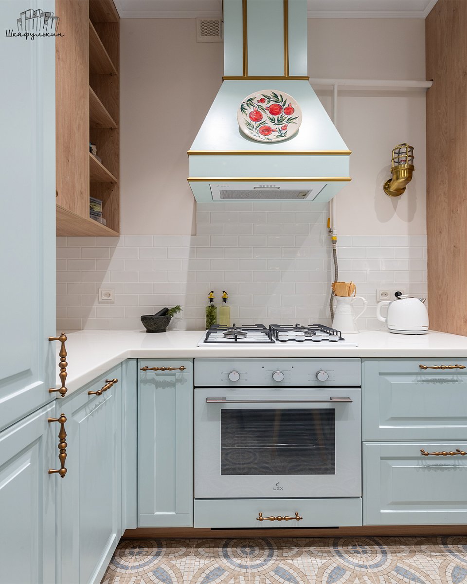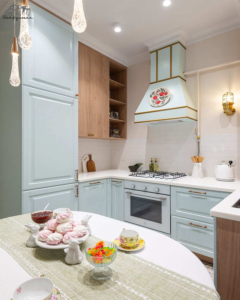 Фасады выполнены из МДФ нежно-голубого цвета с геометрической резьбой. Вместе с фигурными ручками, они стали изюминкой интерьера. Лицевая фурнитура, напоминающая солнечные блики, усиливает ощущение «летнего» тепла. А вот неожиданный штрих — уличный фонарь возле вытяжки — добавил игривости, словно кухня плавно переходит в сад. Небольшая асимметрия прекрасно дополняет оригинальный, очень нежный "экс-интерьер"
