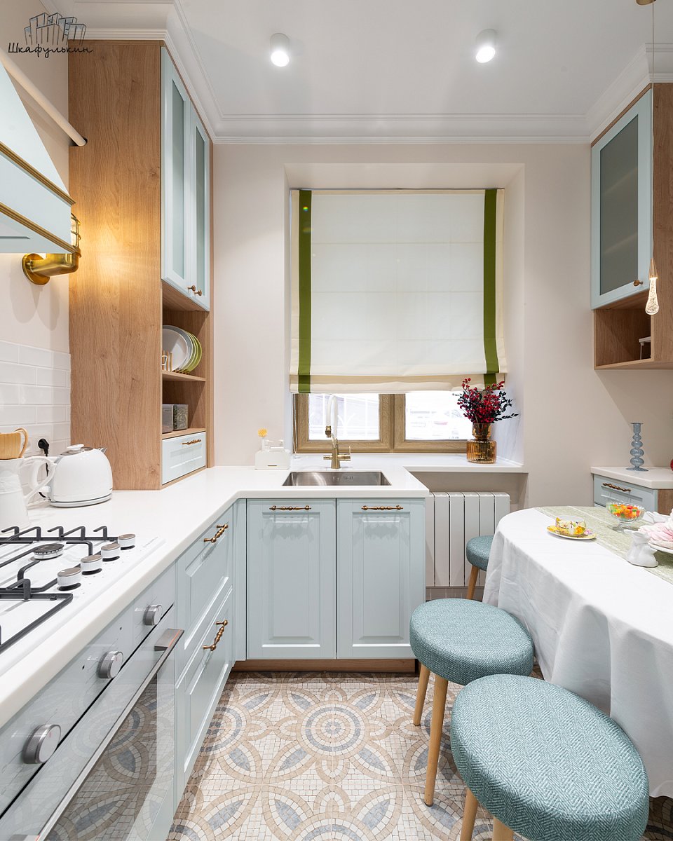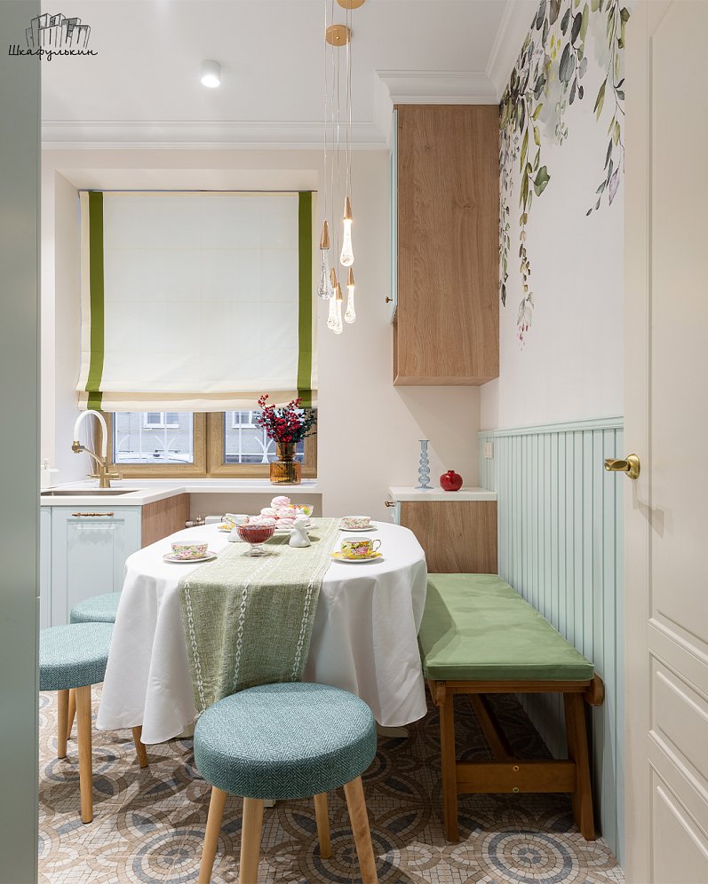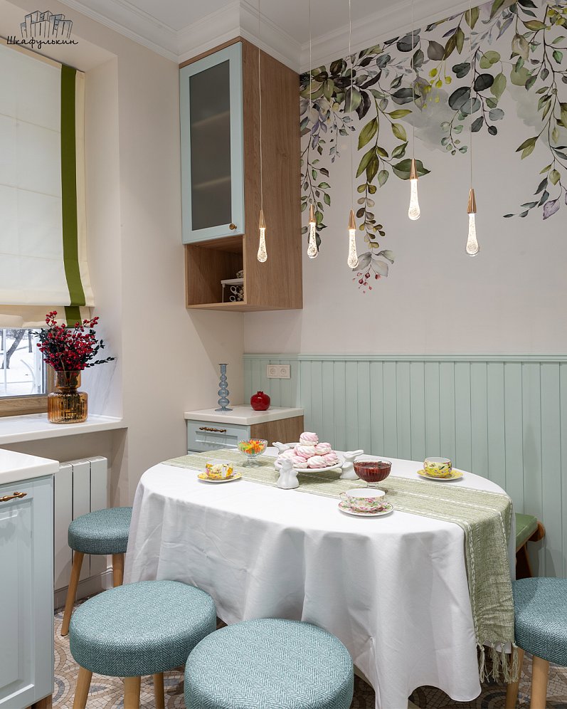 На этот раз дизайнер Ольга Цурикова выбрала концепцию «летней веранды». Стены с обоями, имитирующими лианы, панели в духе деревенского заборчика и светильники-капли сразу переносят в атмосферу теплого сада, в котором только-только прошёл летний дождик. Цветовая палитра — небесно-голубой, белый и бежевый — подчеркивает легкость и привлекает свет в маленькое помещение, а плитка «кабанчик» на фартуке добавляет нотку стиля без излишней строгости.