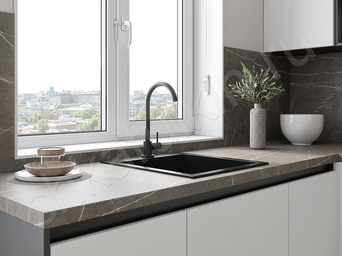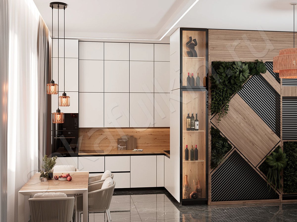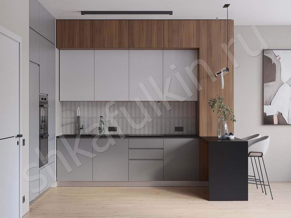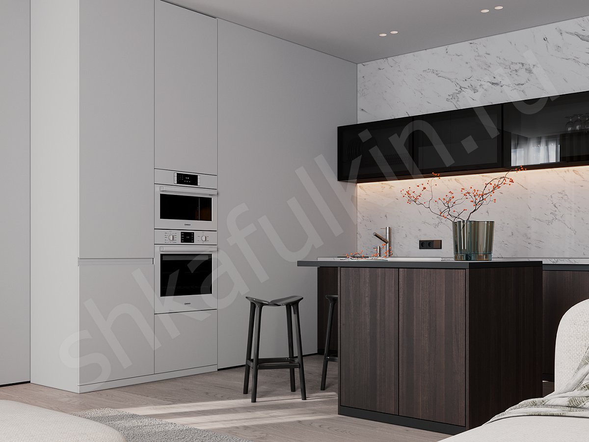 Приведите решение к единообразной палитре – светлые стены, светлая столешница, закрытые фасады.