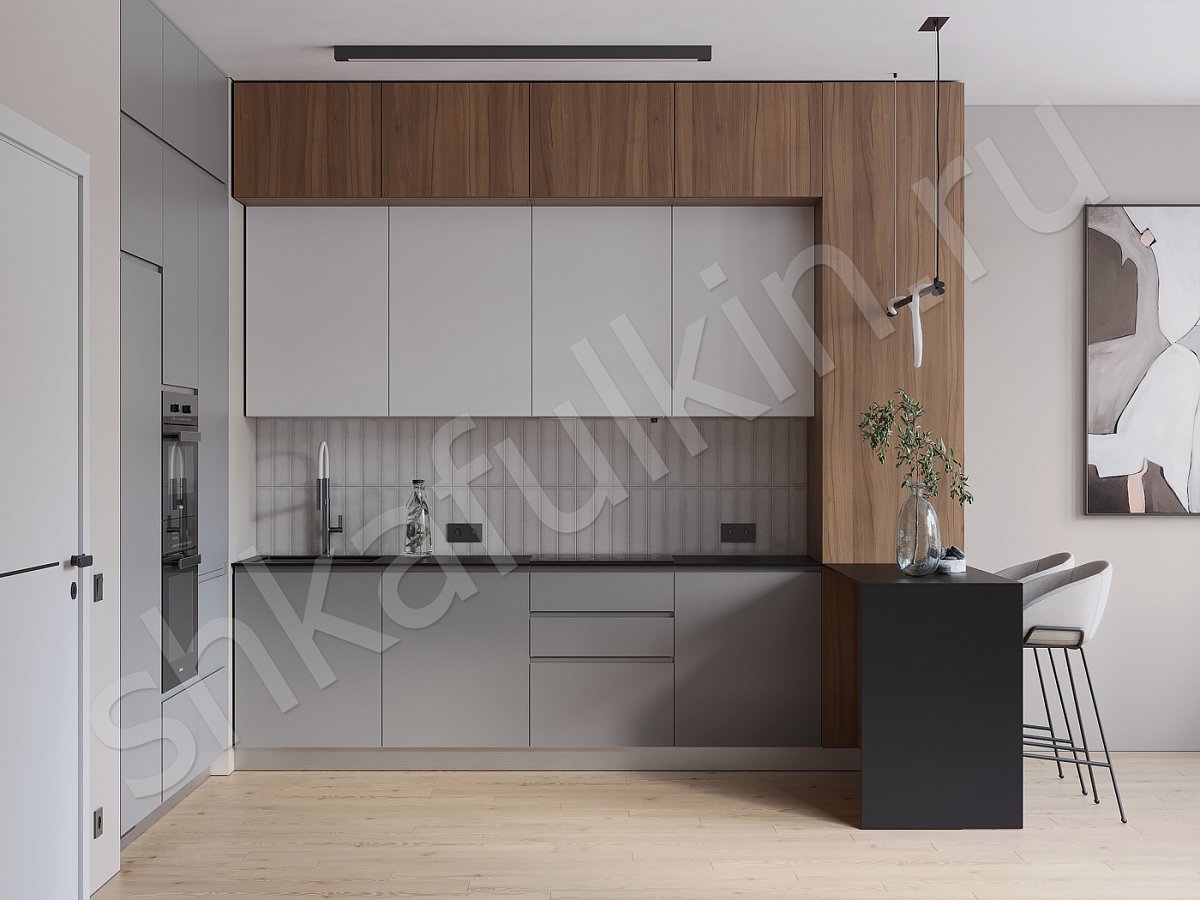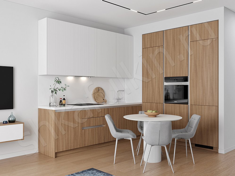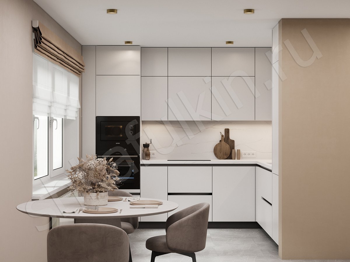 Используйте матовую палитру на фасадах и исключите открытые полки. Это придаст кухне порядка и визуальной «упорядоченности» даже при небольших размерах.