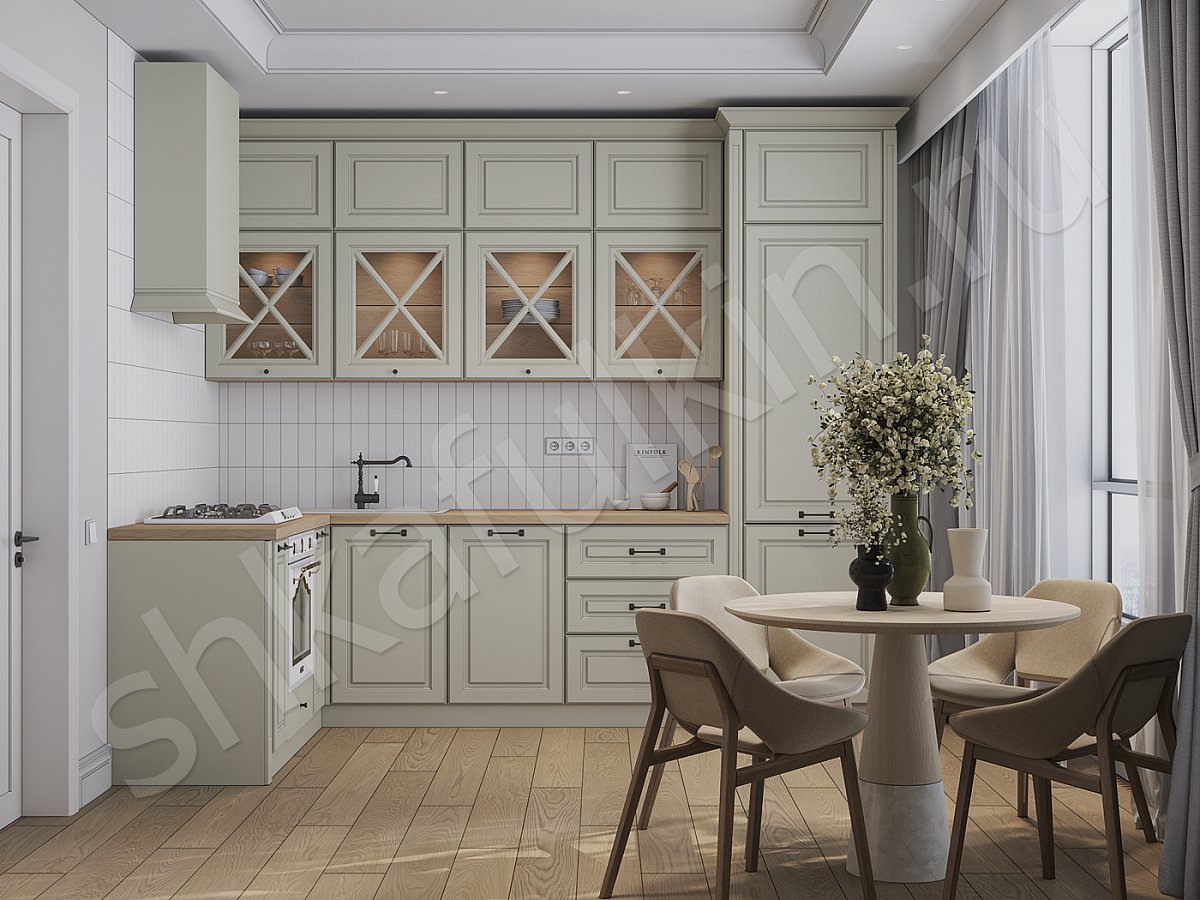 Белый, кремовый, светло-серый, пудровые ноты – такие палитры визуально расширят пространство и придадут кухне спокойствие. Можно добавить мягкую ноту травяного или пастельно-розового акцента.