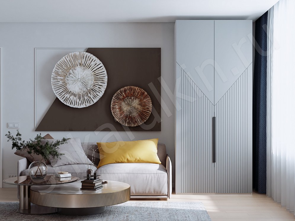 Например, для гостиной идеальным выбором станет серый угловой шкаф с жёлтыми подушками.