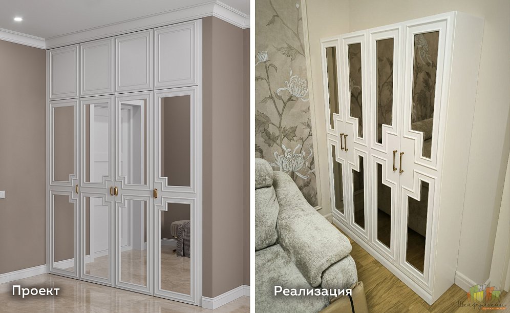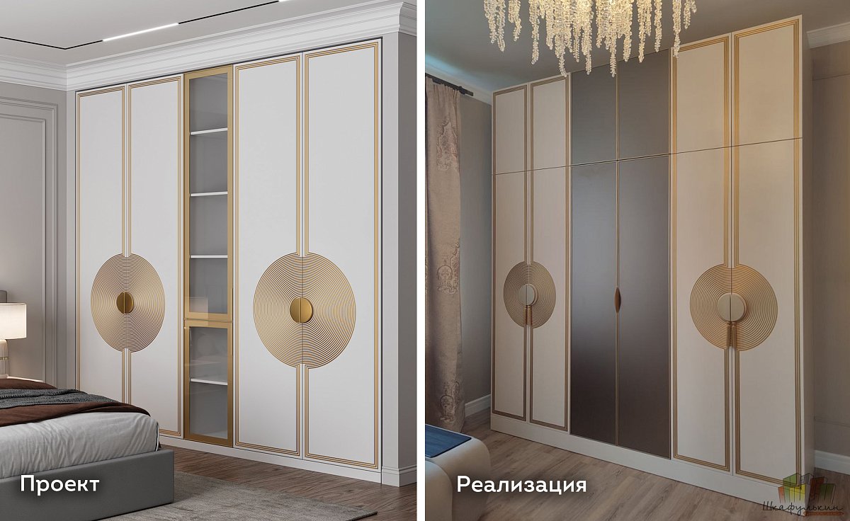 К примеру, представьте себе шкаф в вашей спальной комнате, где роскошь и изысканность сливаются воедино. Его фасады – это полотно, на котором разворачивается завораживающая симфония дизайна. В центре каждой двери, как драгоценные камни в оправе, сияют круги. Их идеальная форма отражая мягкий свет и добавляя пространству глубину. А тончайшие линии позолоты по периметру фасада, нанесённые с ювелирной точностью, подчёркивают совершенство форм и дарят ощущение королевской роскоши.