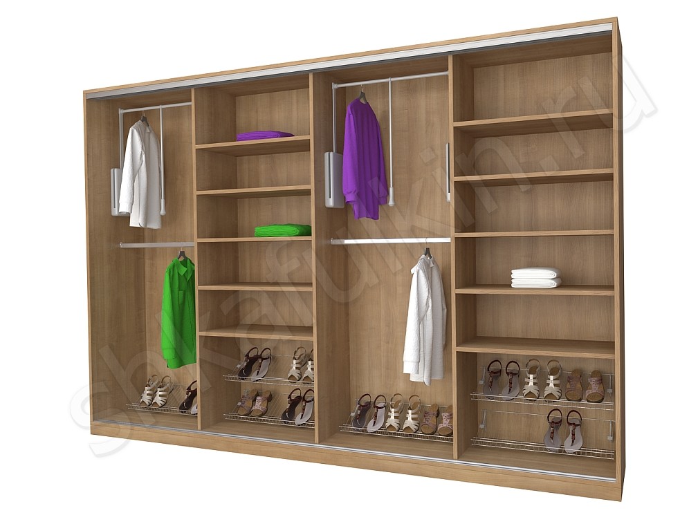 Как правило, на распределение внутренних элементов влияет конструкция шкафа. Например, в угловых внутреннее пространство может быть организовано с учетом особенностей его формы, чтобы максимально эффективно использовать доступное место. Но независимо от конструкции этого предмета интерьера, внутренние элементы обычно представлены различными полками, ящиками, вешалками и другими организационными элементами, которые можно выбрать в соответствии с вашими потребностями и предпочтениями.