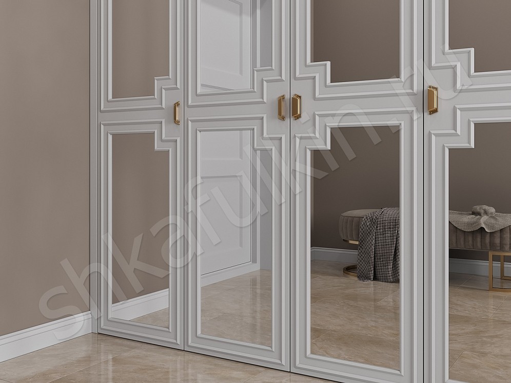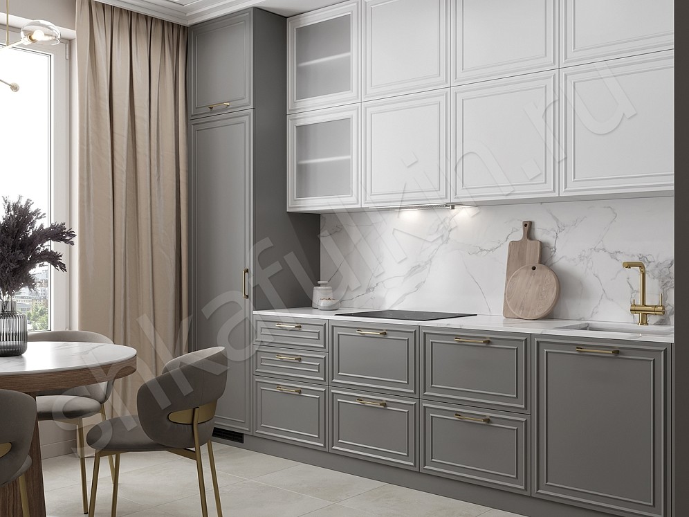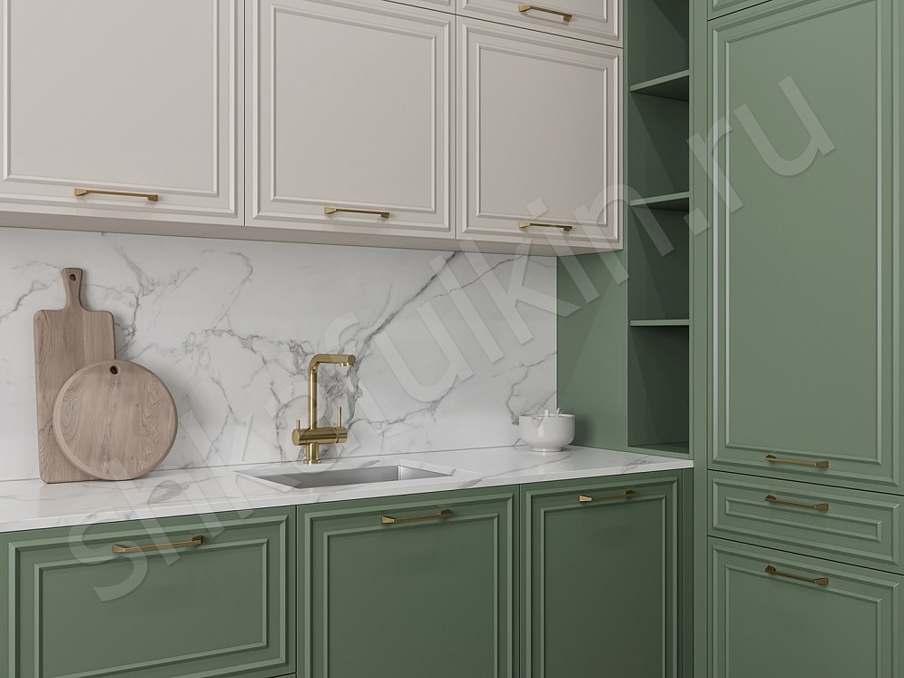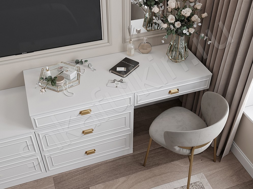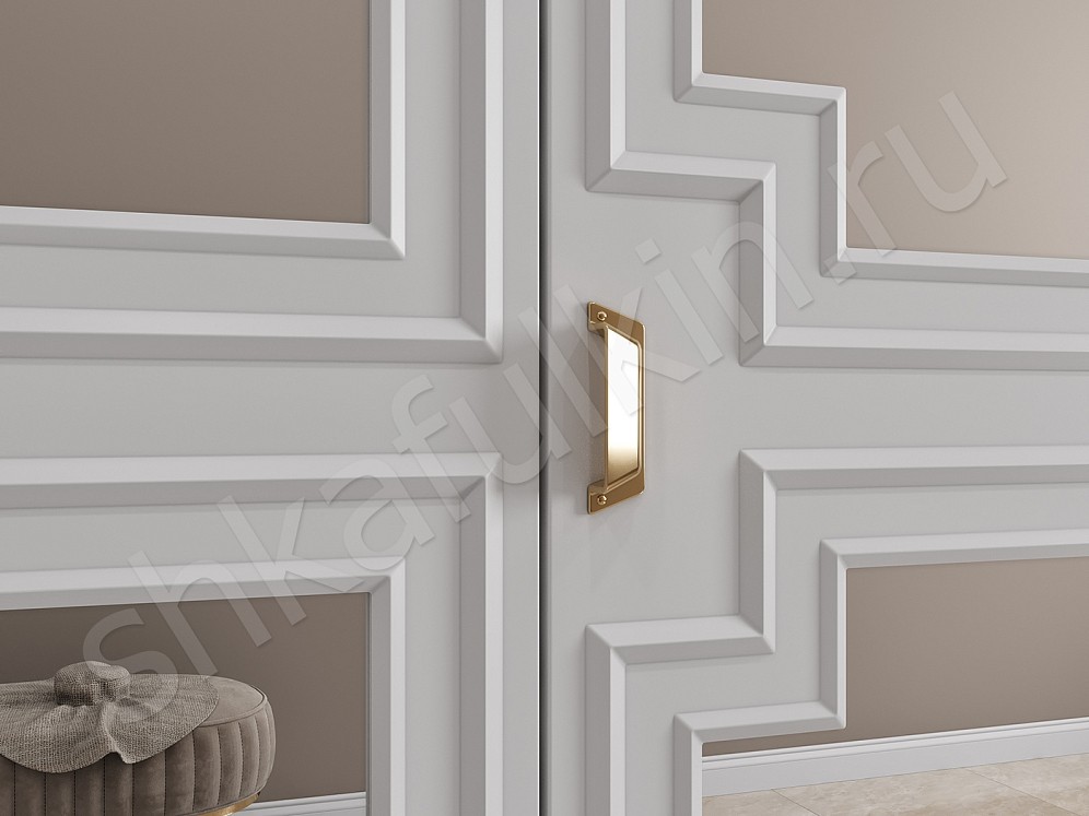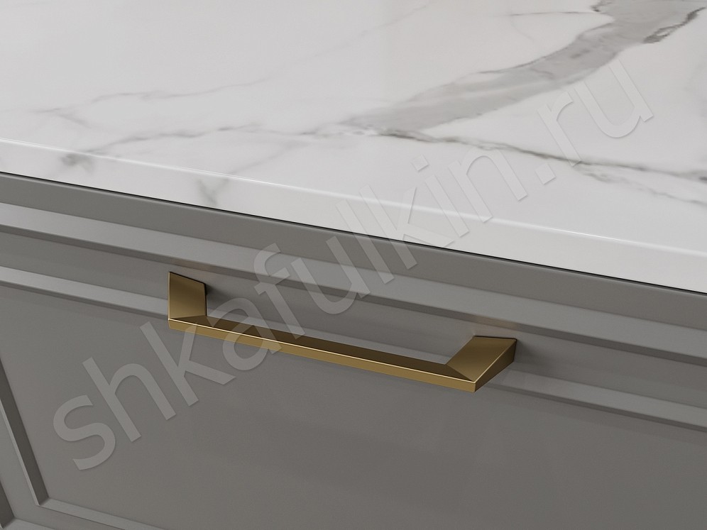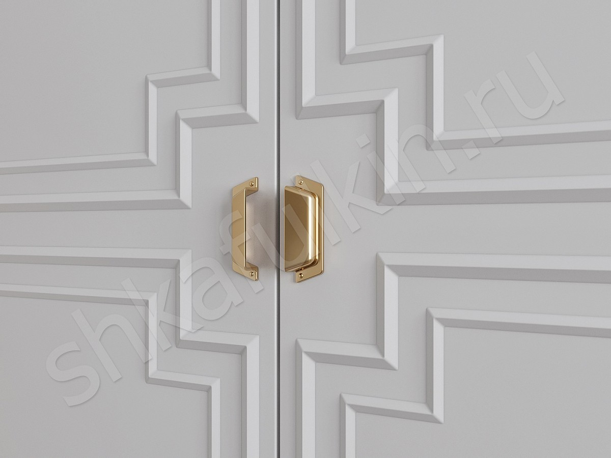 Необходимую текстуру и эффект объема добавляет мебели роскошная, но не вычурная в своём исполнении фрезеровка – здесь она расположена по краям фасада в виде двух параллельно расположенных друг к другу линий. А аккуратные ручки в глянцевой позолоте, выполненные в таком же лаконичном и строгом дизайне, придают мебели завершённый вид и делают её по-настоящему удобной и функциональной.