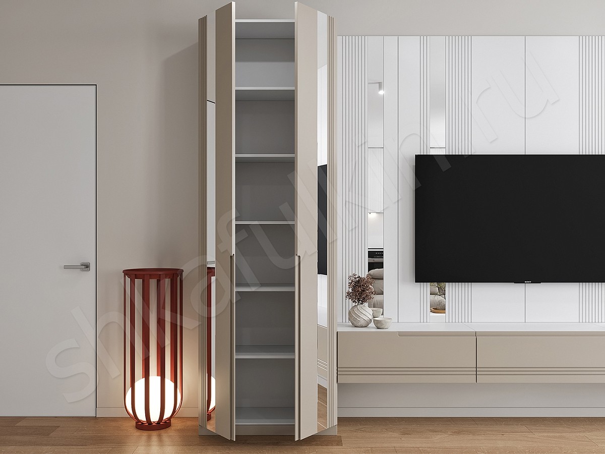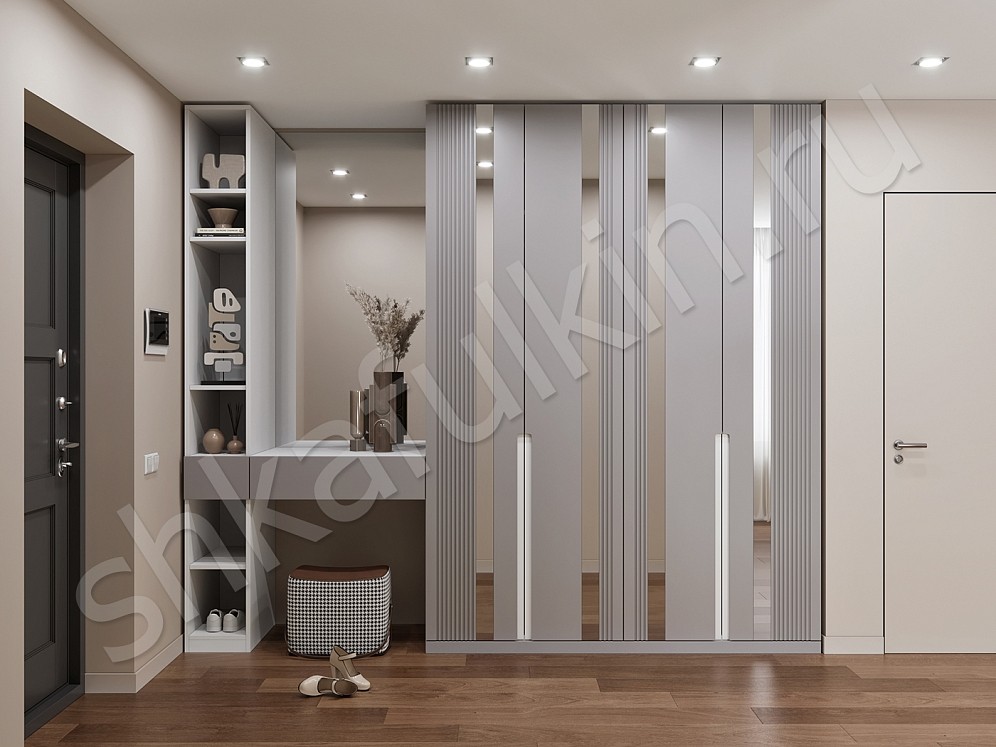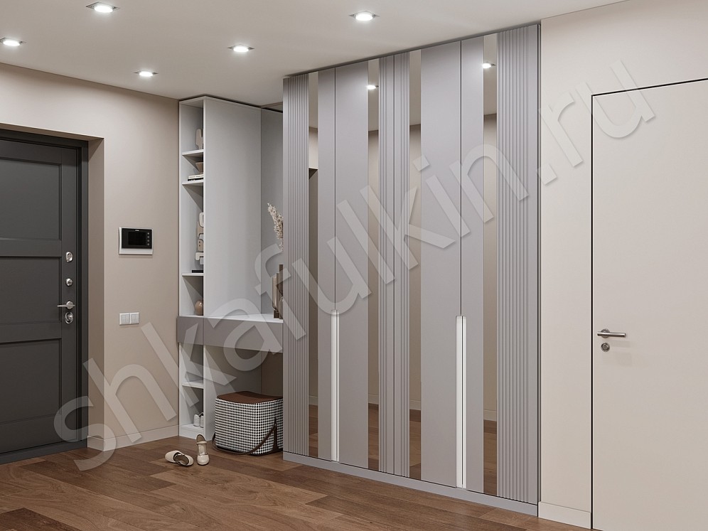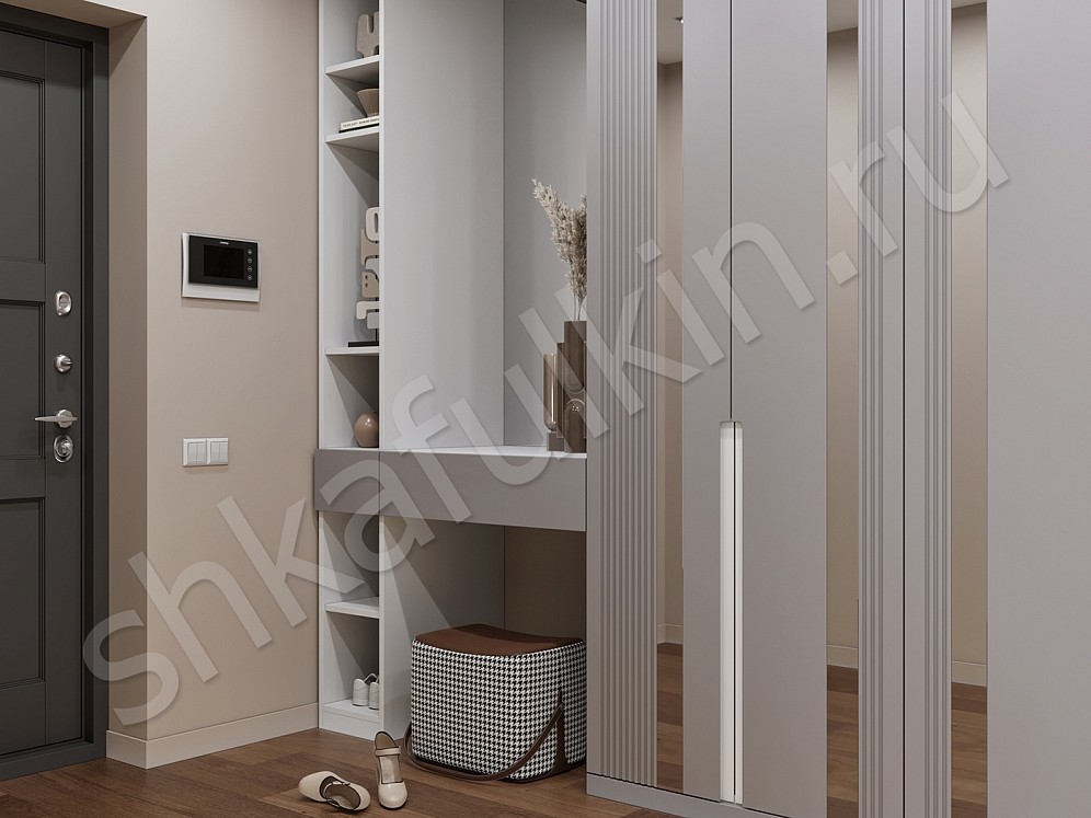 Свой внешний вид, выходя из дома, вы сможете оценить благодаря большому зеркалу, интегрированному в общую композицию прихожей. Особую изюминку и индивидуальность придадут вашей прихожей открытые полки, также входящие в общий ансамбль мебели. На них можно разместить декор, который разбавит интерьер и придаст ему завершённость.