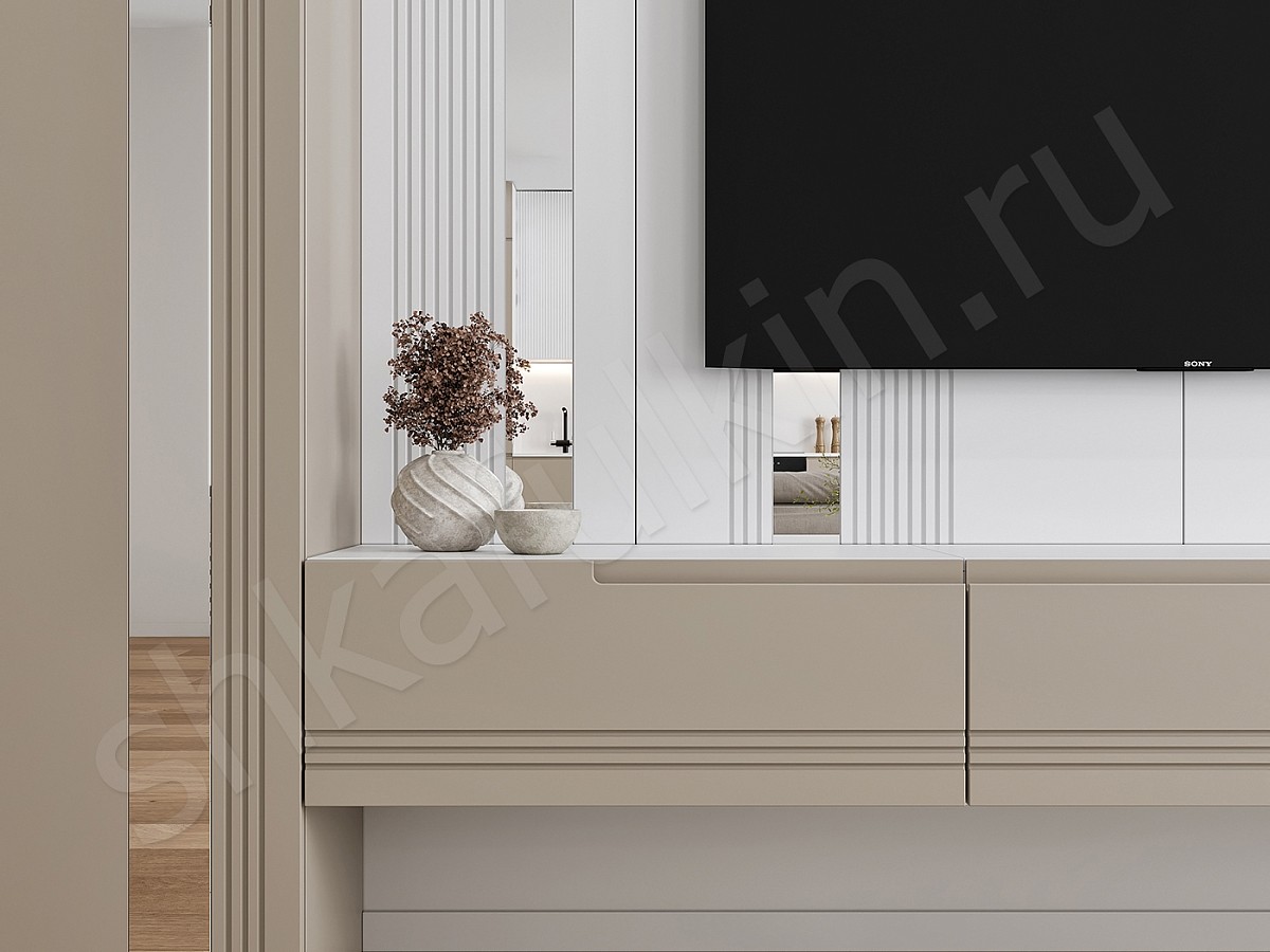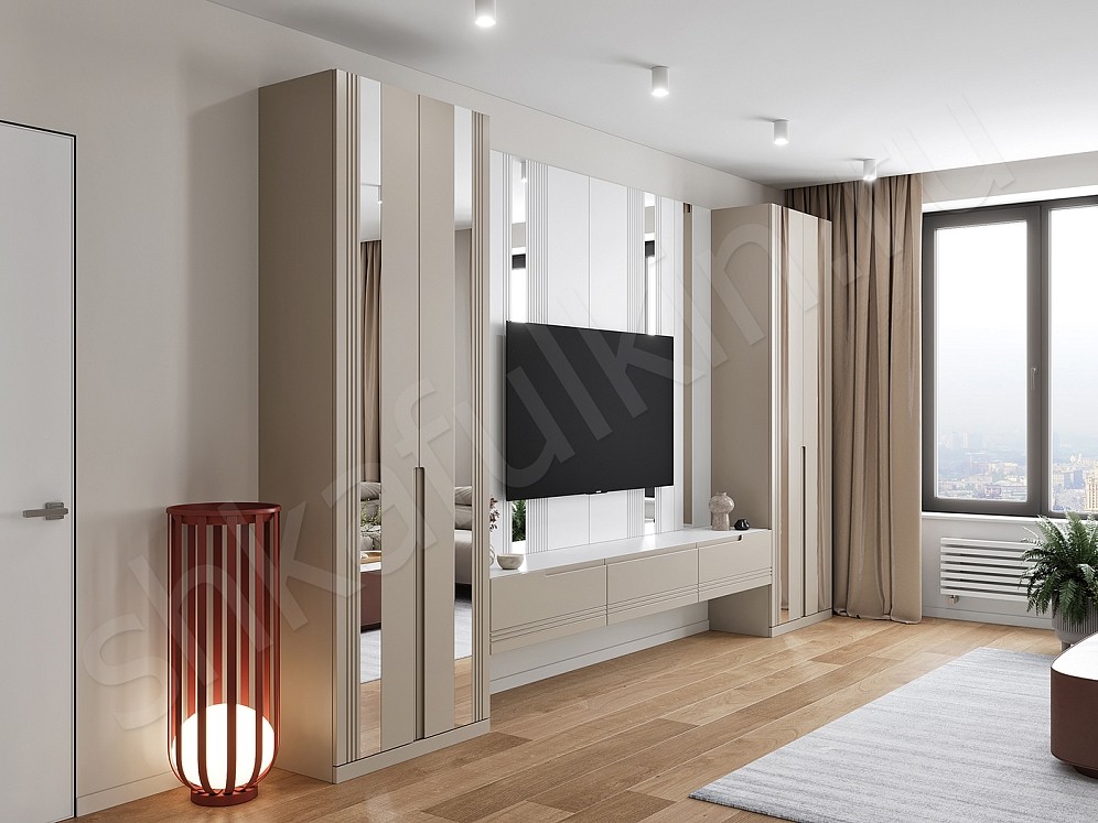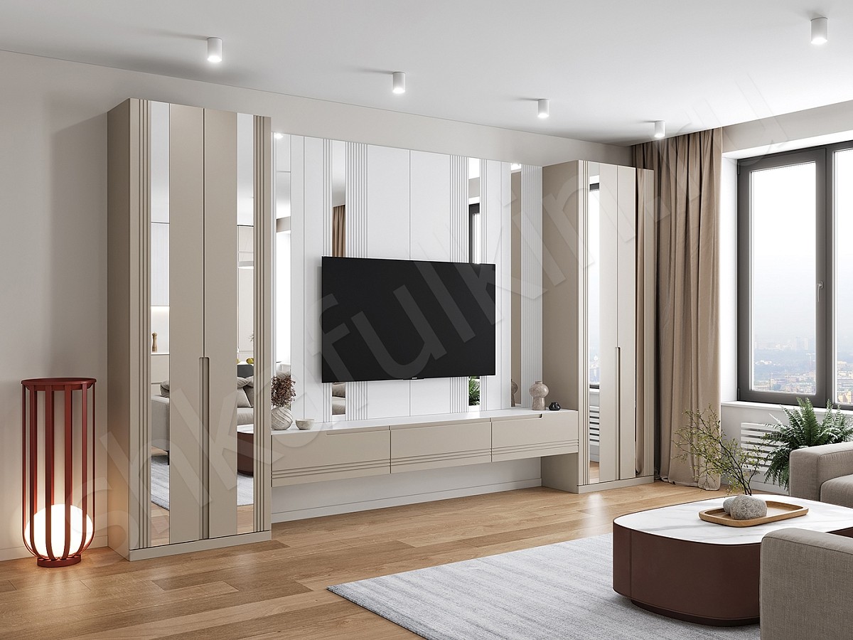 Красивой и уютной сделает вашу гостиную элегантная стенка, в которую входят шкафы с двумя распашными дверьми и вместительный, функциональный комод – вместе они образуют практичную и визуально привлекательную ТВ-зону. Шкафы расположены по бокам и создают лаконичный и завершающий штрих в интерьере.