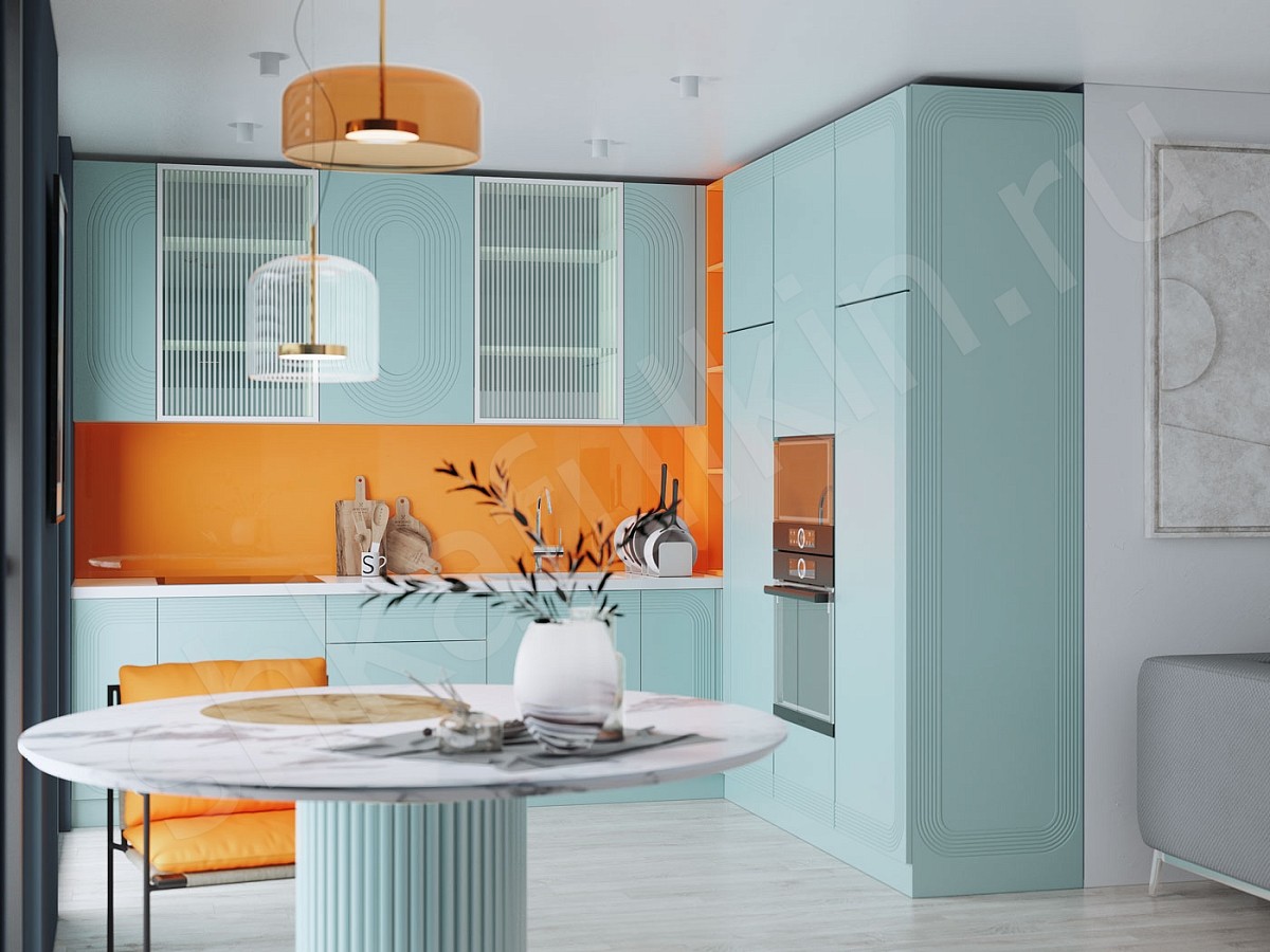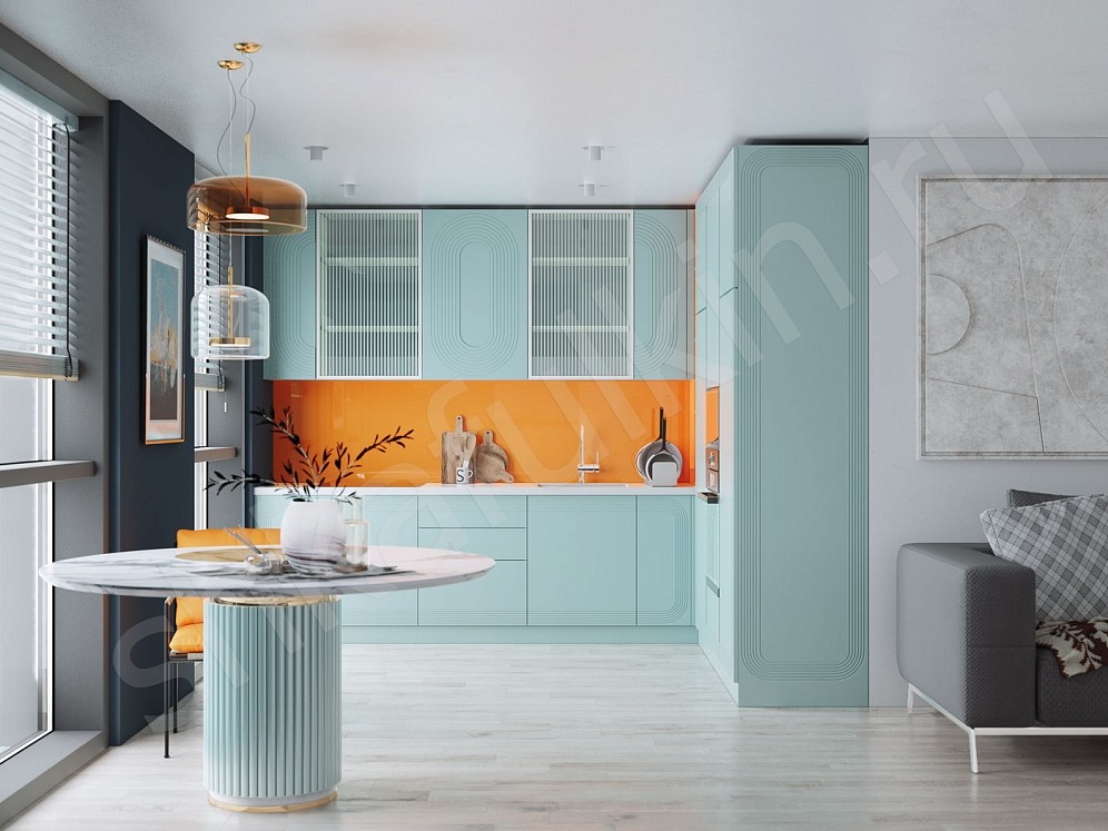 Если вы готовы к буйству красок – кухня «Дзен» для вас! Это не яркость говорливых попугайчиков, а спокойные приглушенные цвета. Нежно-голубой гарнитур гармонирует с оранжевым фартуком придаст вам заряд бодрости больше, чем «Сникерс», окутает теплом и уютом. Кухня объединена с остальной мебелью общим геометрическим узором и отсутствием ручек.