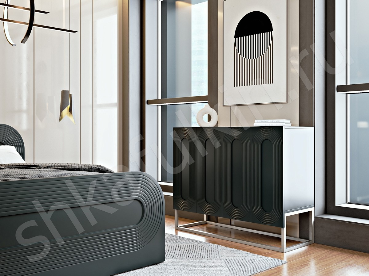 Шкаф в темном насыщенном черном цвете, дополнен лаконичным, рельефным геометрическим узором. В шкафах для спальни предусмотрены противоположно-разные цветовые сочетания: есть большие отделения для хранения одежды, а также стеллажный отсек для интерьерных украшений или книг.