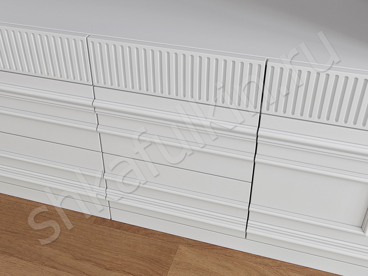 Лейтмотивом коллекции «Джорджия» стала уникальная фрезеровка в форме прямоугольника на фасаде. Такая дизайнерская задумка помогла придать характерную симметрию и упорядоченность, что в свою очередь, «разбавила» массивность мебели и создала в дизайне некий баланс.