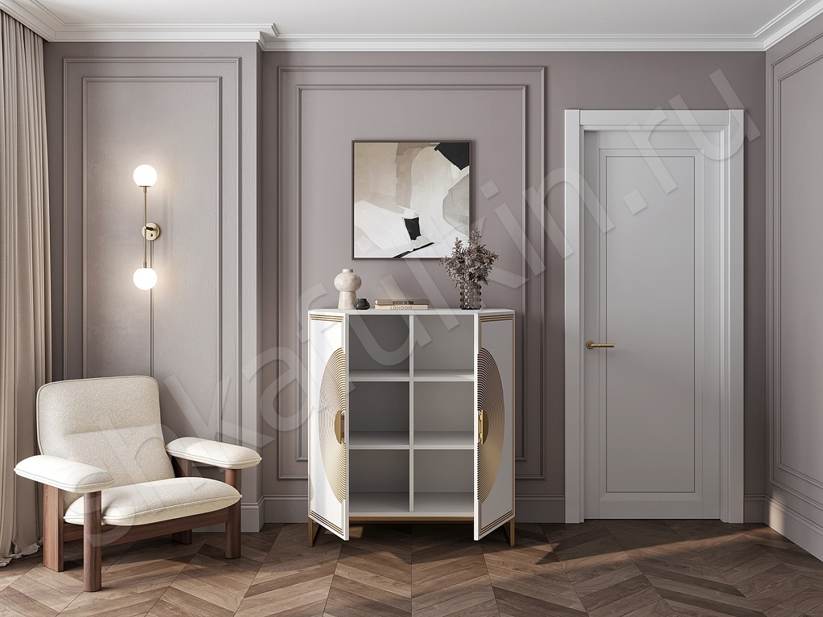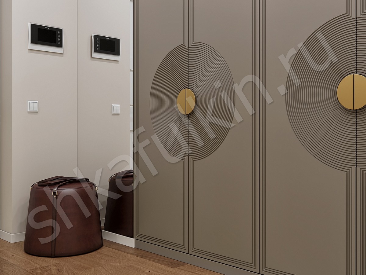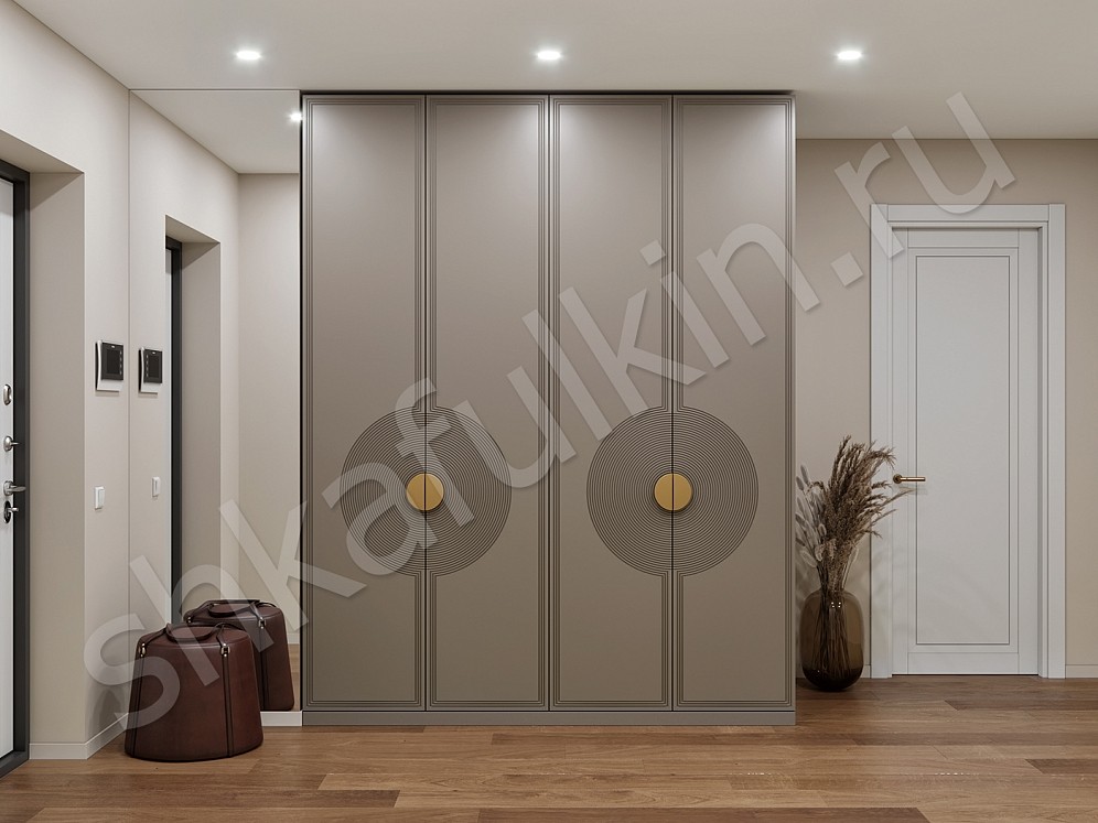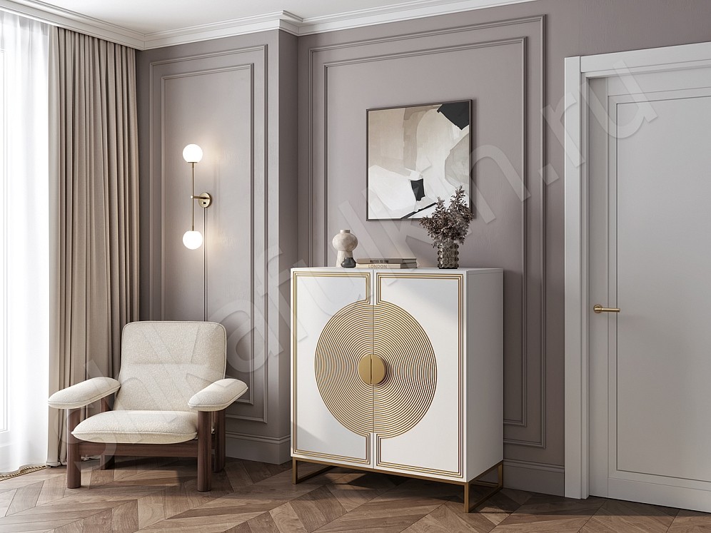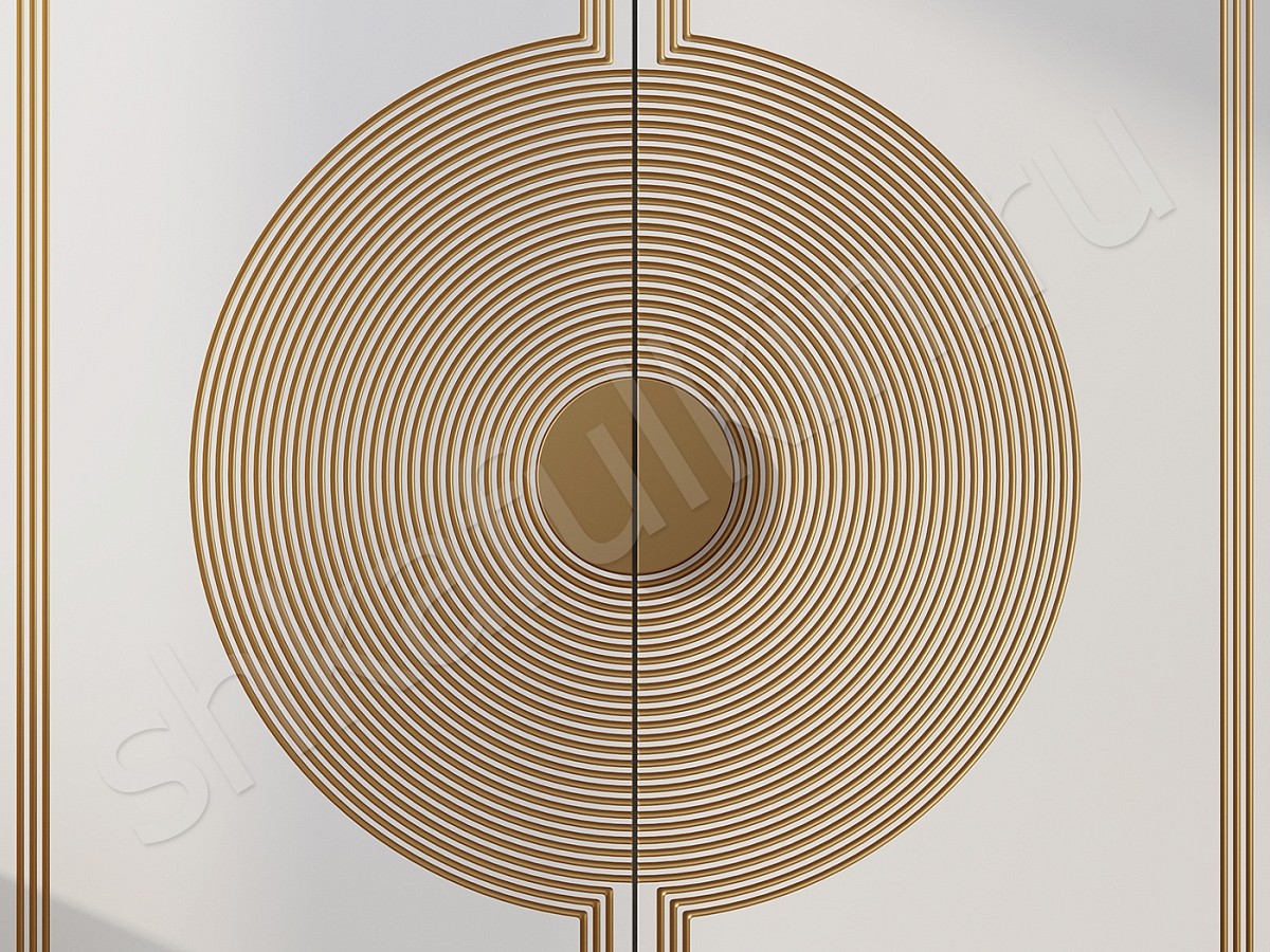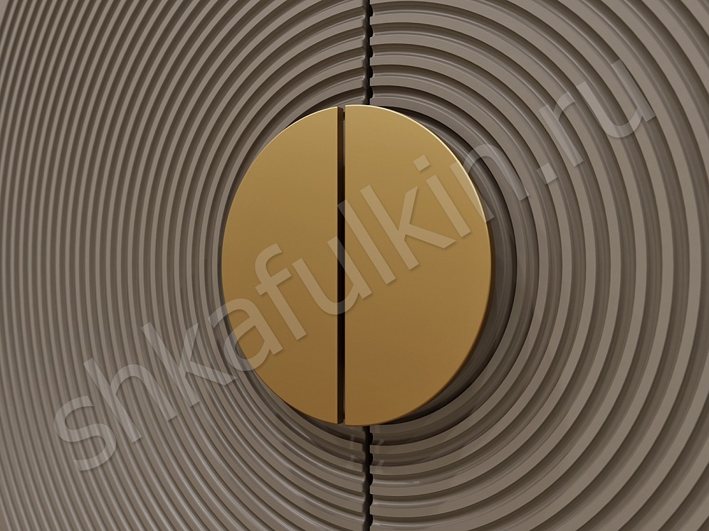 В свою очередь, фрезеровка по бокам фасада создаёт дополнительную симметрию и как бы упорядочивает пространство достаточно лёгкими и плавными штрихами. К примеру, такой утончённый и ненавязчивый рисунок «разбавляет» и облегчает массивность и основательность шкафа, подчёркивая его элегантный внешний вид и солидность. А латунные ручки шкафа с позолоченным глянцевым покрытием добавляют в общую композицию дизайна роскошь и шарм.