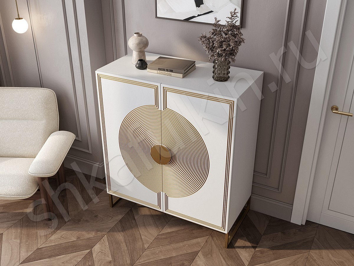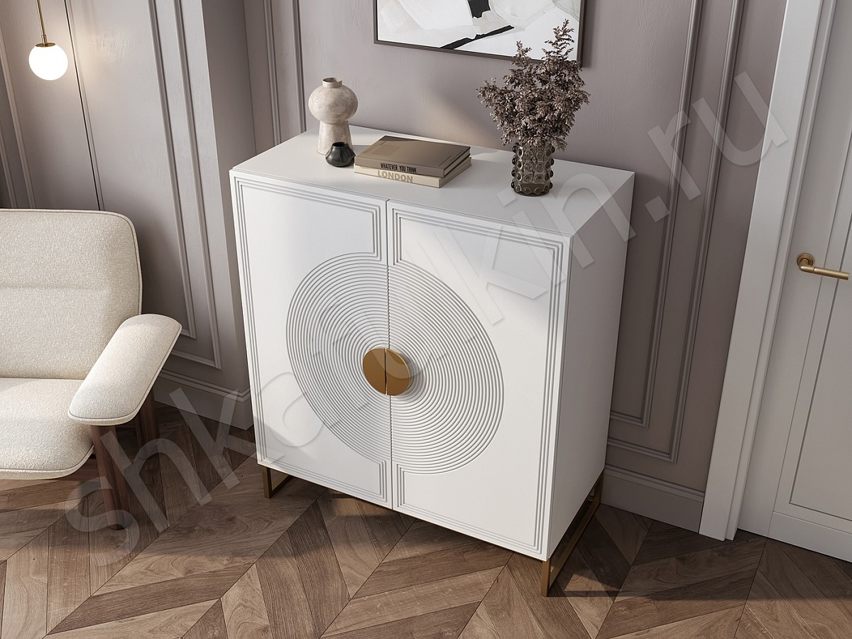 Кстати, интересной деталью и некой изюминкой в дизайне тумбы выступает аналогичная фрезеровка в форме интегрированного круглого орнамента на фасаде. Кстати, частота «шага» у фрезеровки играет не последнюю роль в создании эффекта грациозности и глубины, способствующие визуальному восприятию изделия и позволяющие добавить в интерьер достаточно заметный и эффектный штрих.