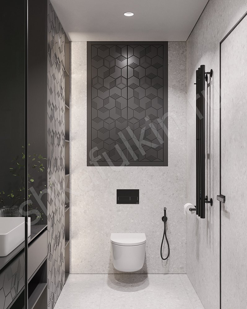 В ванной комнате обычно выбирают более нейтральные и устойчивые к воздействию влаги цвета – серый, светло-бежевый или даже чёрные оттенки. В этом случае соты приобретают особую изящность и создают ощущение стильного пространства.