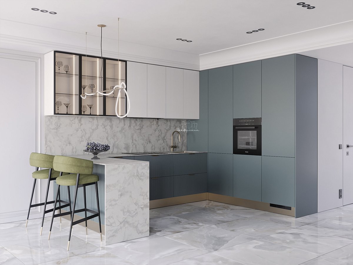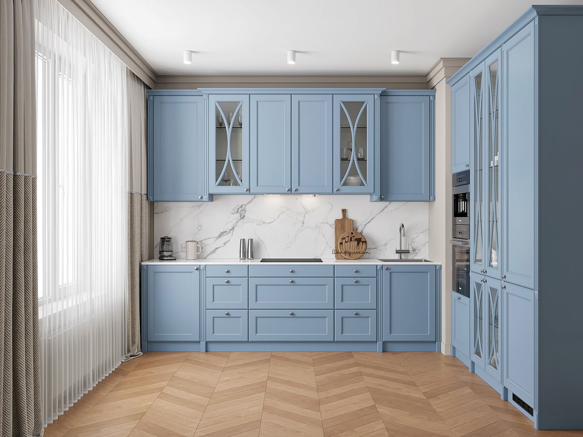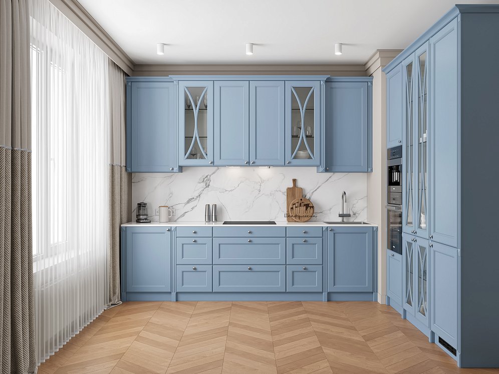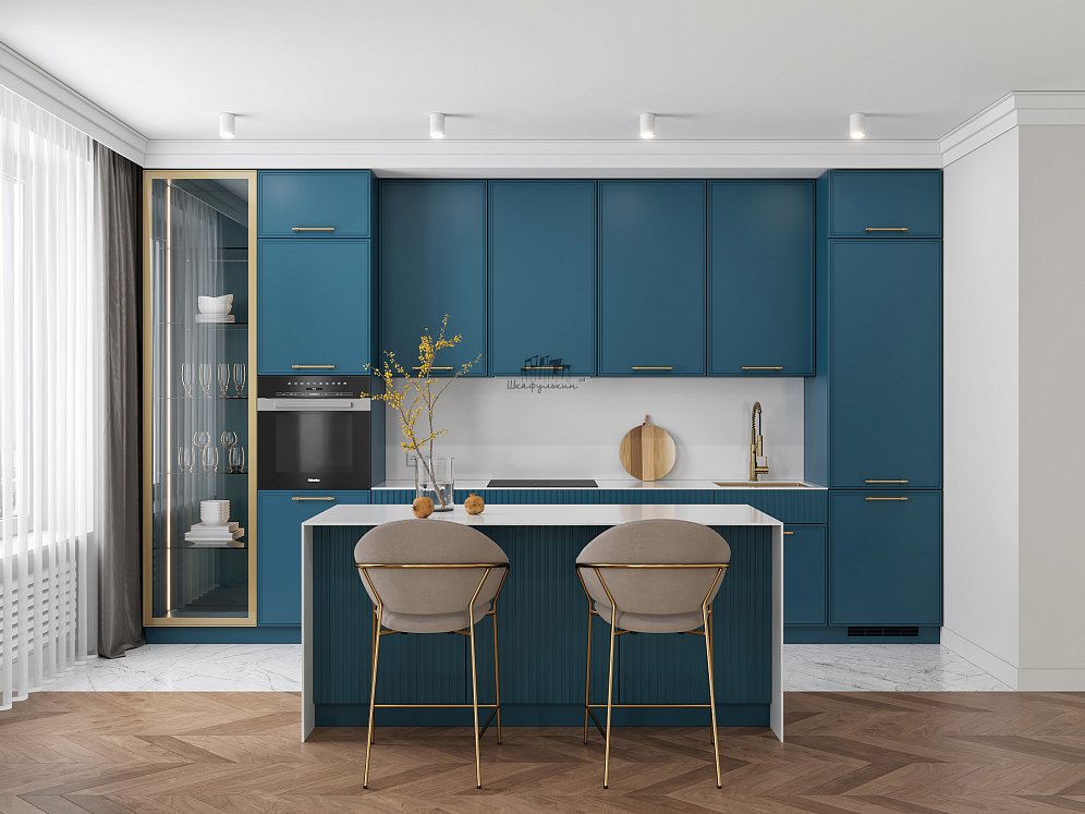 В свою очередь, синий придаст интерьеру элегантность и утончённость. Его часто комбинируют с металлическими элементами, которые могут быть как матовыми, так и глянцевыми.