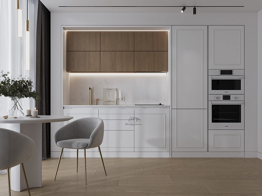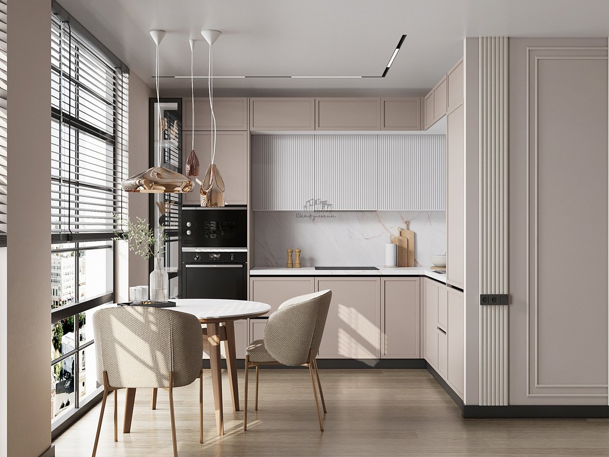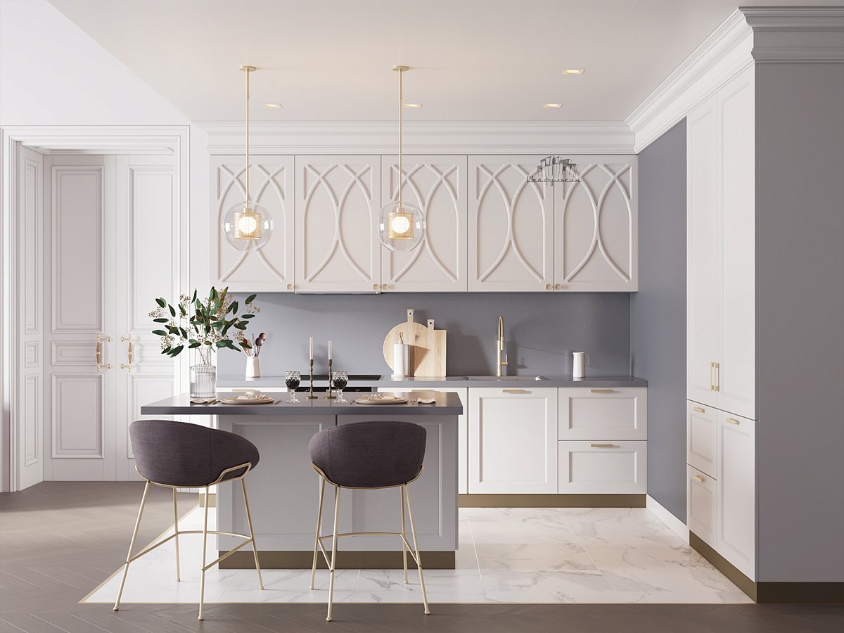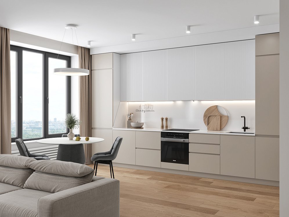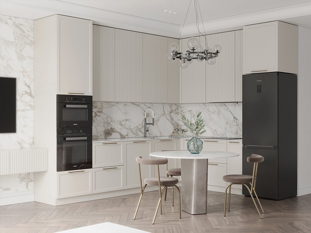 Универсальной и долговечной сделают кухню нейтральные оттенки. Всегда актуальны белый, серый и бежевый. Они легко обновляются с помощью новых аксессуаров и декора.