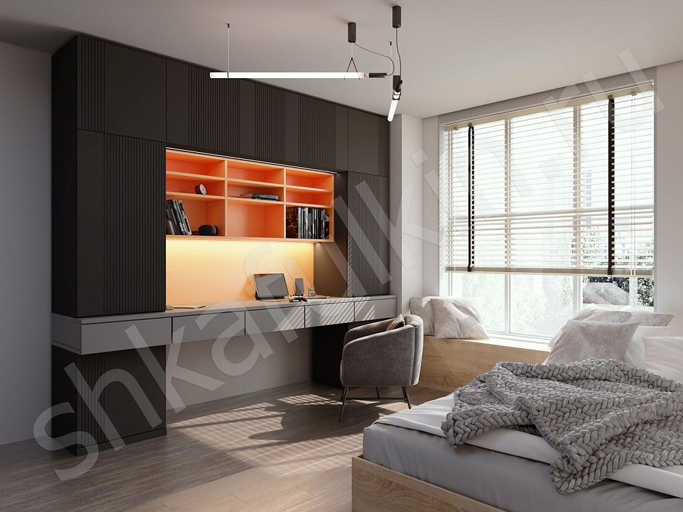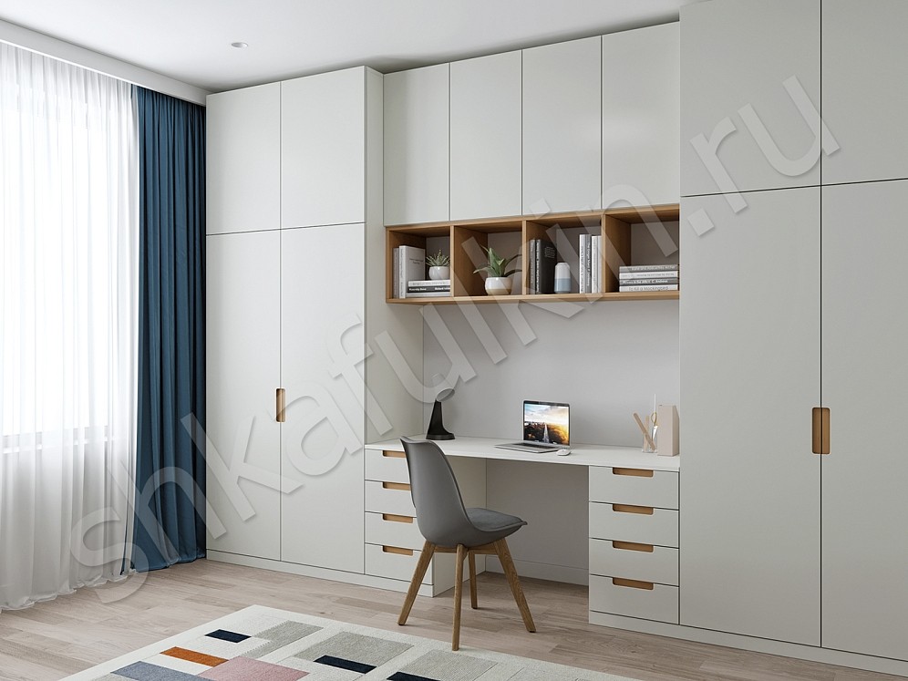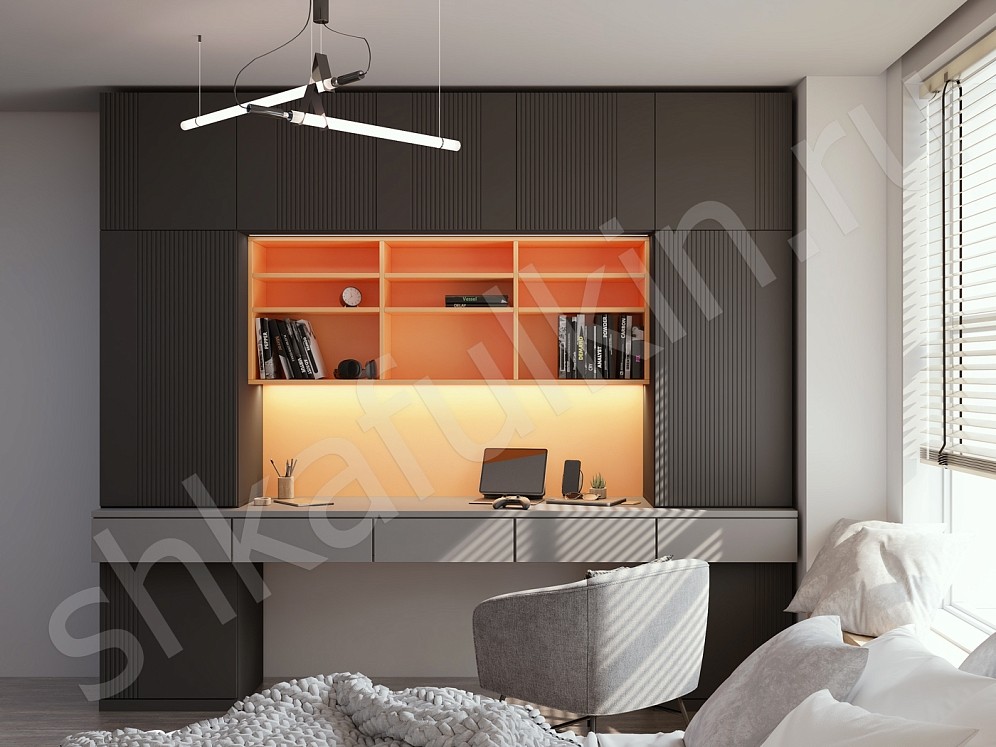- Отсутствие массивных элементов – мебель без массивных тумбочек, подставок и лишних деталей создаёт визуальную лёгкость и упрощает пространство вокруг стола, что способствует концентрации и улучшению производительности.