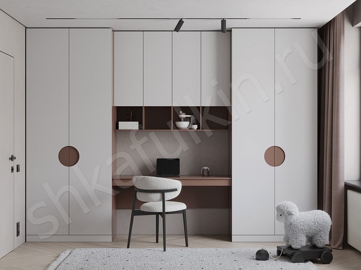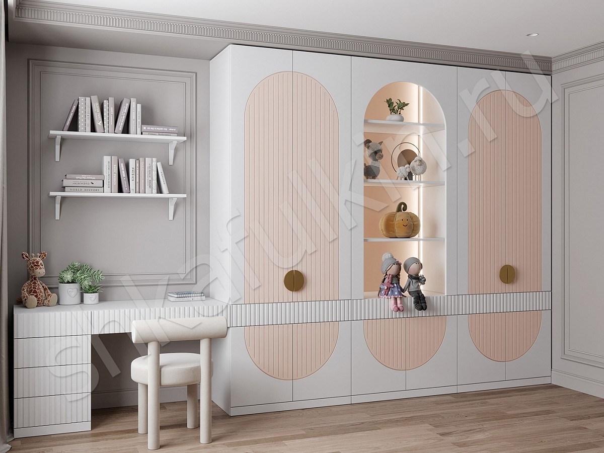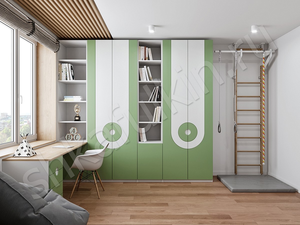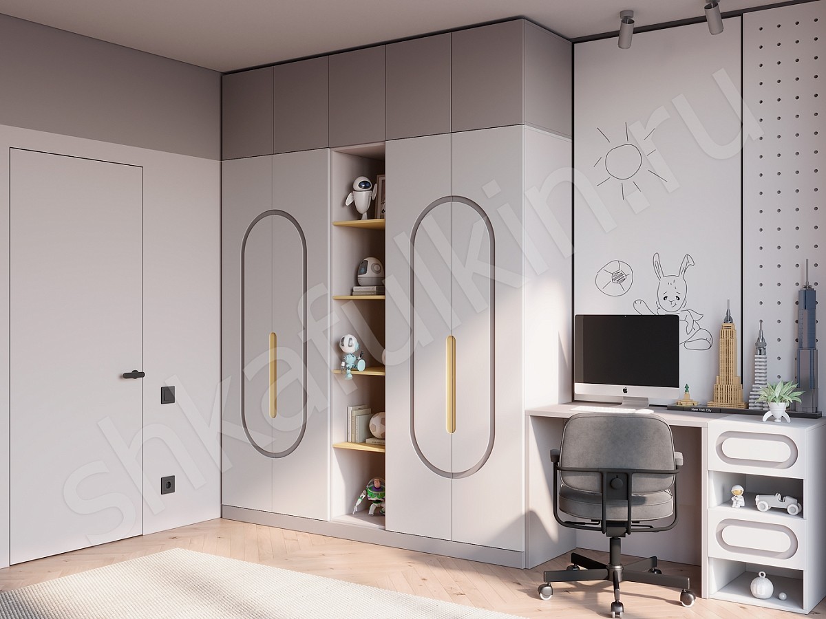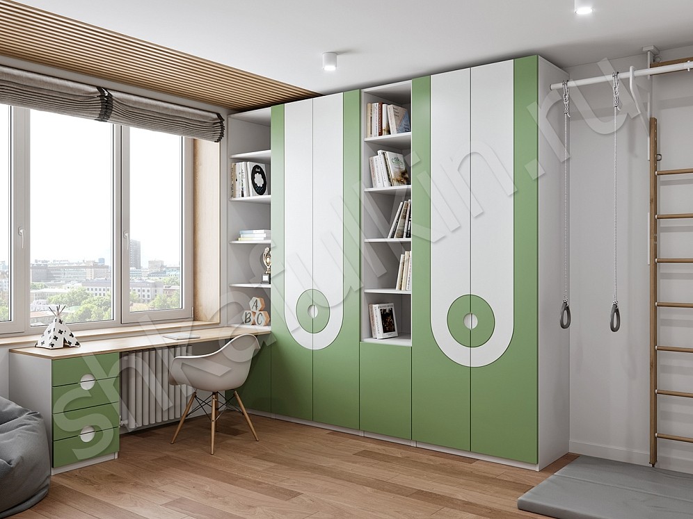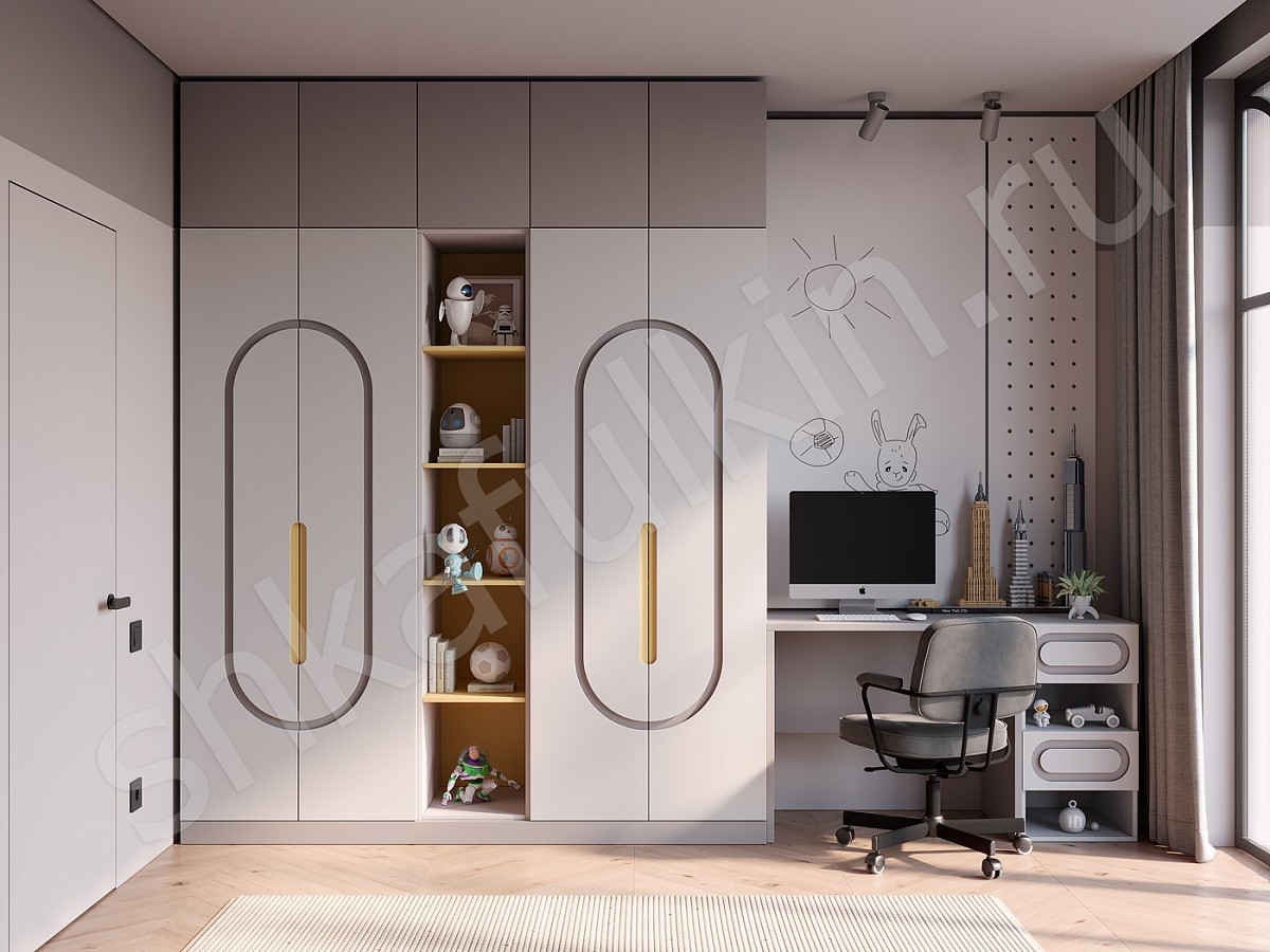 Также очень интересное и функциональное решение, которое крайне популярно среди детей – это использование круглой ниши в нижней части шкафа. К примеру, это может стать уютным уголком для игр, где ребёнок будет проводить время, воображая себя на корабле, в буре или в каком-то другом месте из своих фантазий. Также в этой нише можно читать или просто отдыхать.