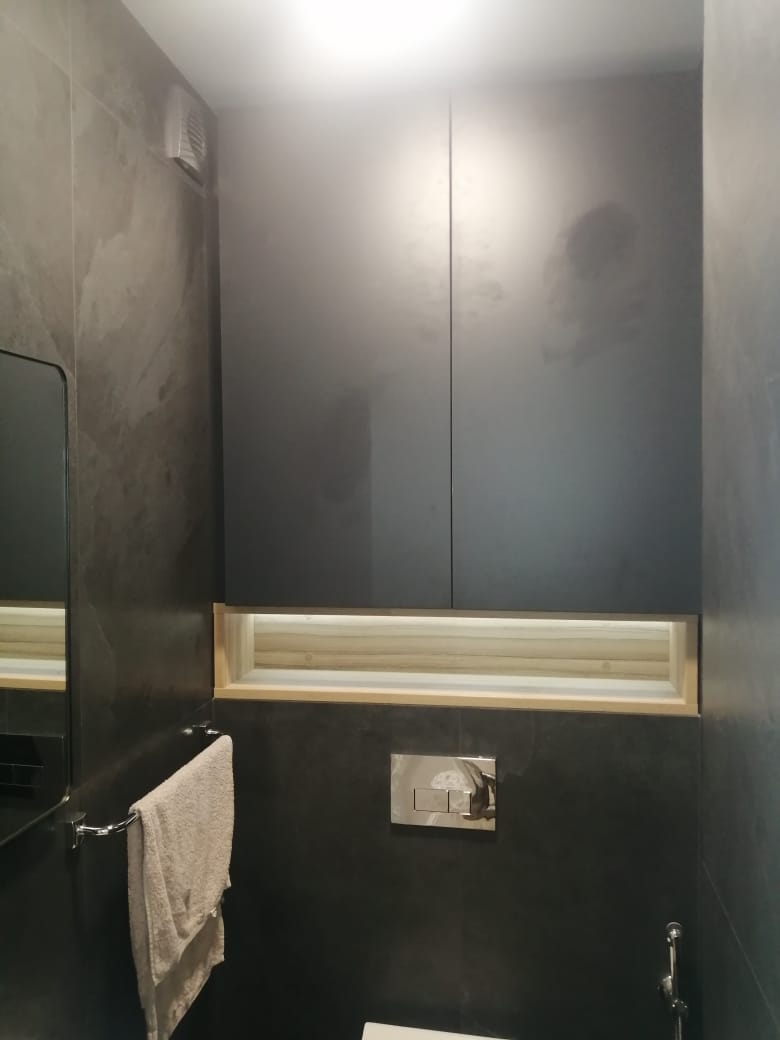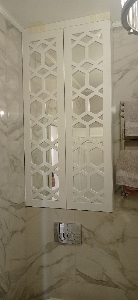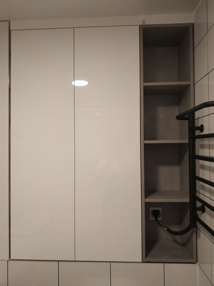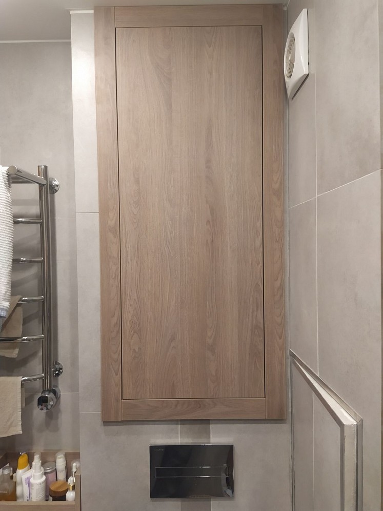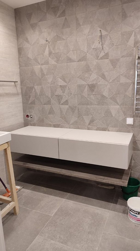 МДФ плохо переносит влажную среду, поэтому, при изготовлении мебели для ванной его пропитывают гидрофобными веществами, защитными составами и покрывают пленкой. На плиту наносится два-три слоя грунтующего полиуретанового состава и защитно-декоративная эмаль. В результате поверхность получает красивый глянец.