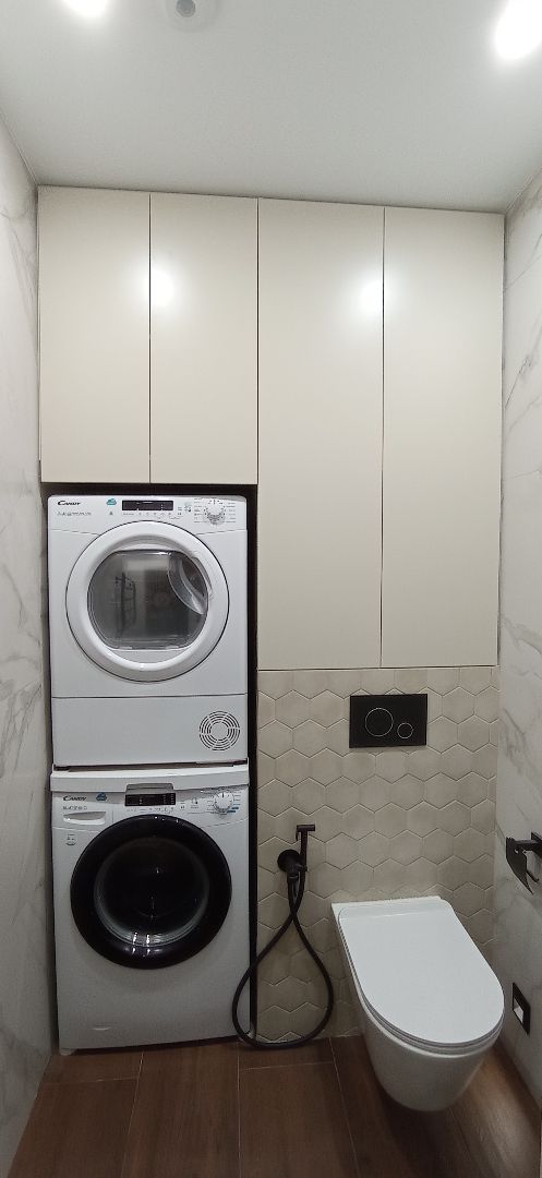Очень удобна для малогабаритных комнат, достойно смотрится в просторных ваннах. Она компактная и эргономичная. Облегчает уборку в труднодоступных местах, визуально делает интерьер легким за счет "парящего" эффекта. Подвесные шкафы скрывают коммуникации, расположенные вдоль стен (трубы, бойлер).