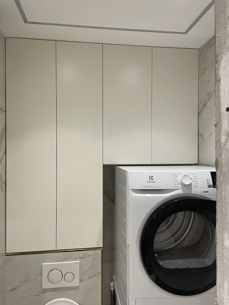 Конструкции на ножках приоритетней, когда важно обеспечить долговечность предметов - вода, попадающая на пол, не контактирует с мебелью. Напольные конструкции на цоколе предпочтительнее, т.к. скрывают инженерные коммуникации (шланги, сифоны, подводки). Дополнительные элементы (ящики, полки) позволяют эффективно организовать хранение моющих средств.