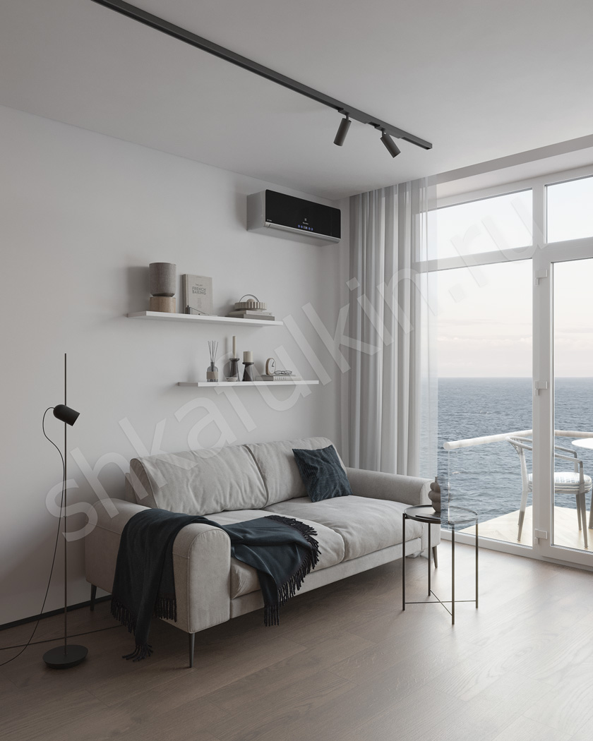Размещенный так, чтобы открывать вид на море через большие окна, диван служит не только местом для отдыха, но и идеальной точкой для созерцания окружающей красоты. Мягкий свет, проникающий через тюль, создаёт расслабленную атмосферу.