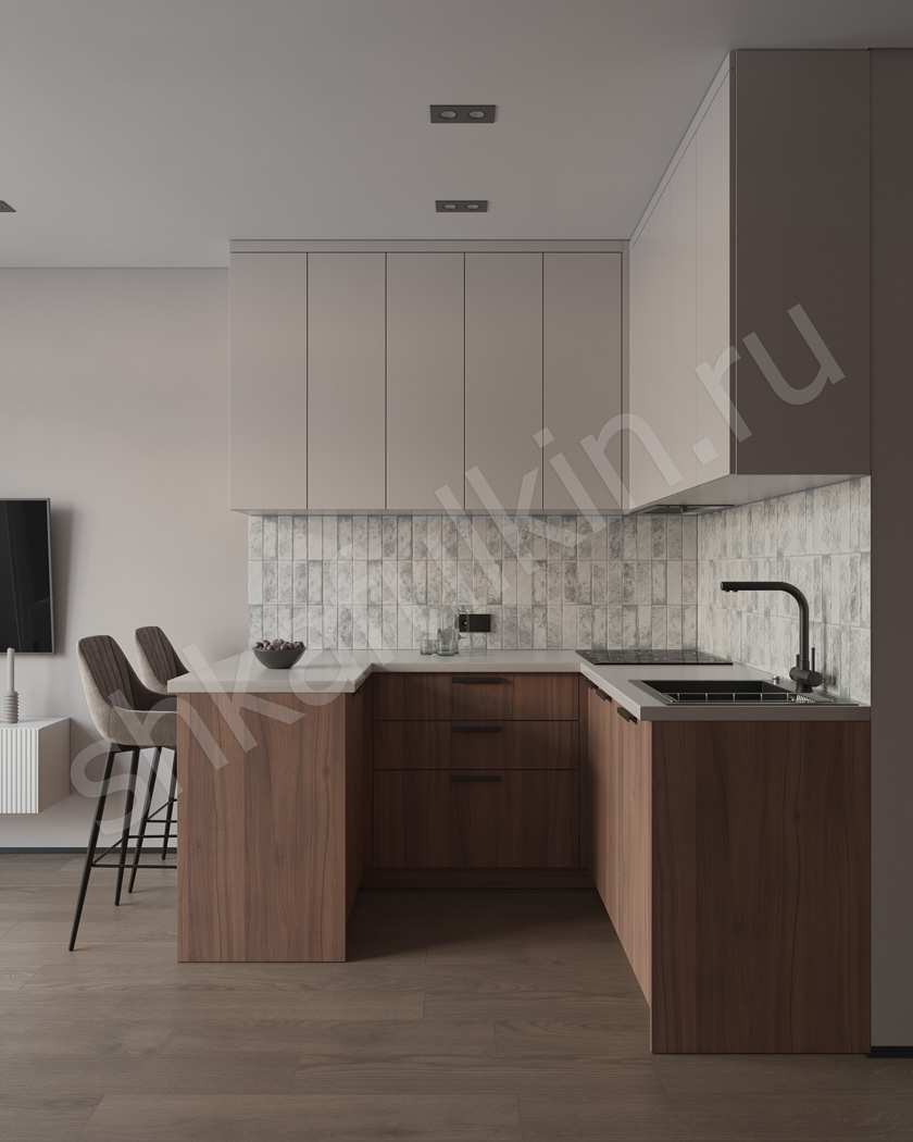 Барные стулья, стоящие вдоль столешницы, добавляют нотки уюта и комфорта. Их элегантный и современный дизайн с мягкой обивкой и стильными подлокотниками делает их идеальными для долгих ужинов в компании друзей или семейных посиделок. Другими словами, такое решение не только эффективно использует пространство, но и создает зону, где можно собираться вместе, готовить и общаться.