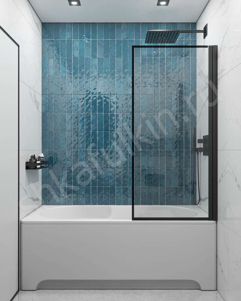 Небольшая ванна, отделенная стеклянной перегородкой, создаёт элегантное и современное пространство, наполненное светом и воздухом. Прозрачные стенки перегородки позволяют визуально расширить интерьер, придавая ему лёгкость и не загромождая пространство. Это решение также обеспечивает необходимую приватность, оставаясь стильным акцентом.