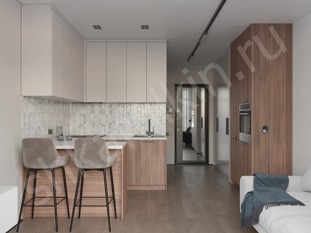Диван в бежевых оттенках становится сердцем этой квартиры-студии, создавая атмосферу уюта и спокойствия. Его мягкие линии и обивка из приятной на ощупь ткани приглашают расслабиться и насладиться комфортом после долгого дня. Бежевый цвет, универсальный и нейтральный, легко вписывается в любую цветовую палитру, позволяя использовать яркие акценты в декоре (к примеру, подушки или плед).