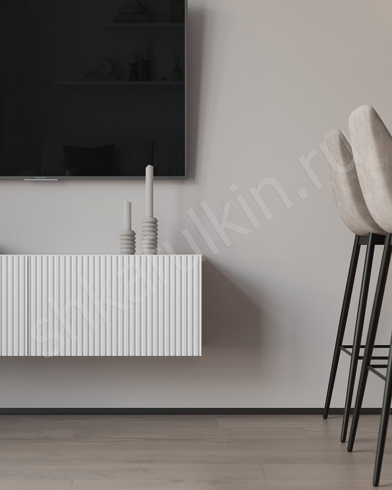 Над комодом аккуратно установлен телевизор, который гармонично вписывается в общий интерьер. Вместе они образуют стильный ансамбль, где функциональность сочетается с эстетикой.