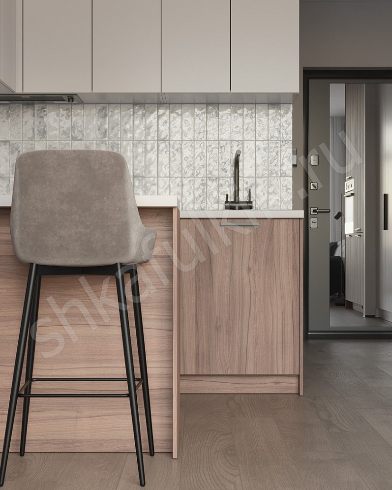 Кстати, фасады шкафа выполнены в тех же оттенках и текстурах, что и кухня, создавая впечатление целостности и концептуальности. Это решение позволяет избежать резких контрастов и делает пространство более уютным и эргономичным.