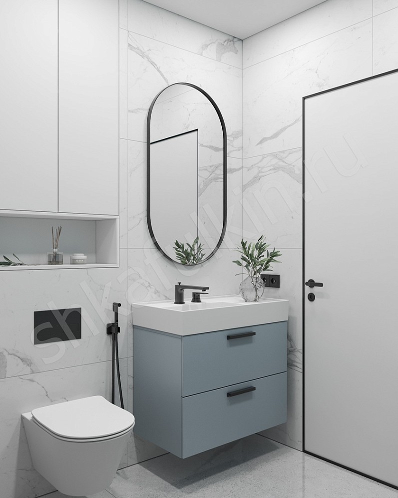К слову, встроенный шкафчик в ванной комнате, размещенный в нише стены, экономит место и придаёт интерьеру аккуратный и современный вид. В свою очередь, дверцы шкафчика оформлены в том же тоне, что и стены – это создаёт достаточно гармоничное единство стиля. Внутреннее пространство шкафа тщательно продумано: полки позволяют удобно хранить все необходимые предметы – от косметических средств до бытовой химии.