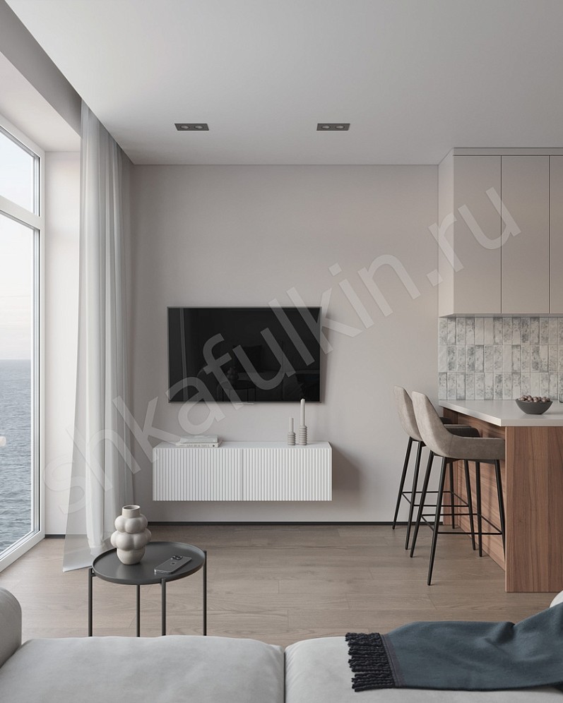 В этой стильной квартире-студии внимание привлекает изящная тумба под ТВ, расположенный вдоль одной из стен. Его уникальный дизайн создает иллюзию невесомости: подвесной комод, поддерживаемый скрытыми креплениями, добавляя пространству лёгкость и современность.