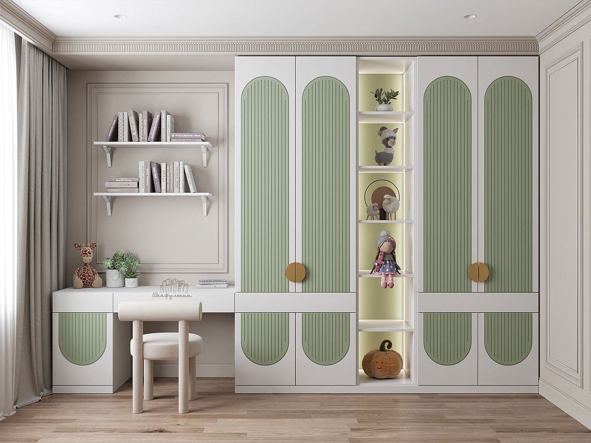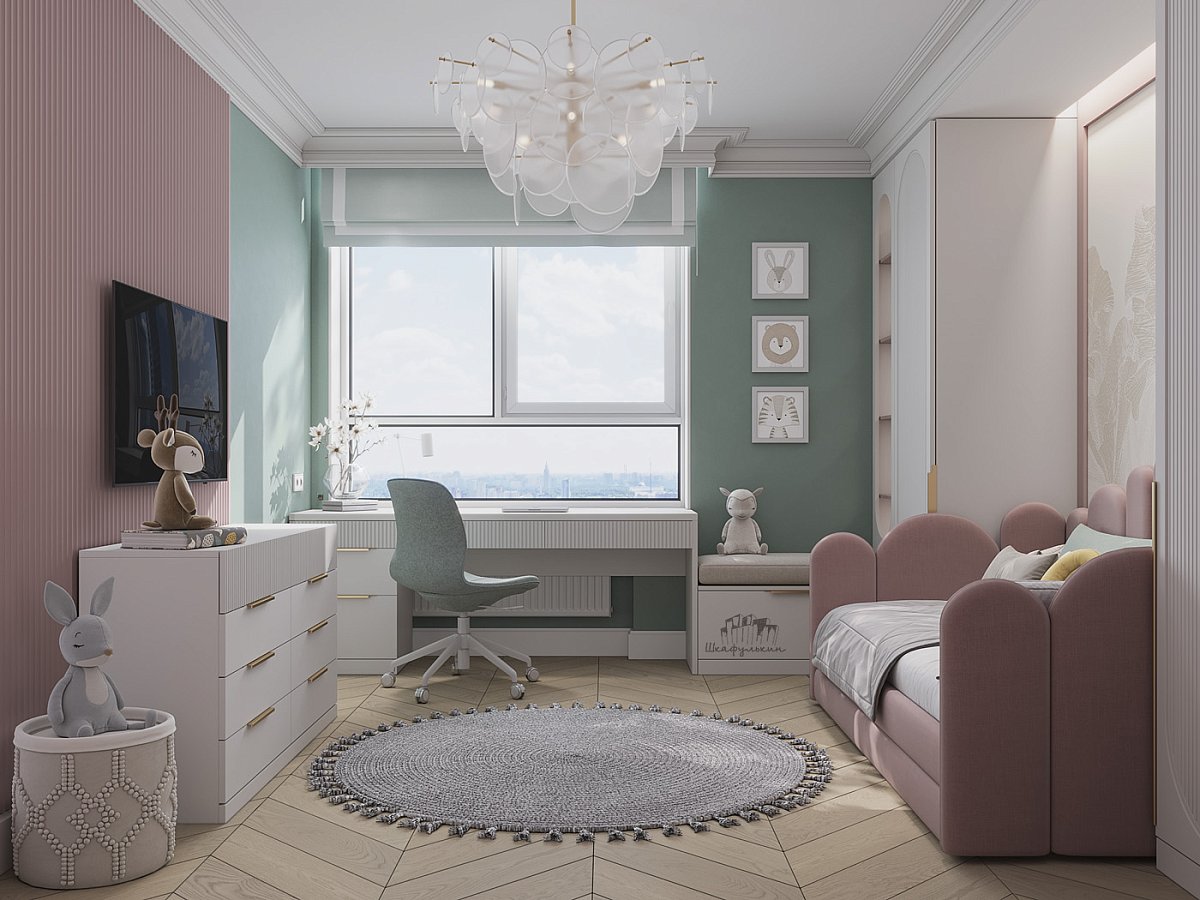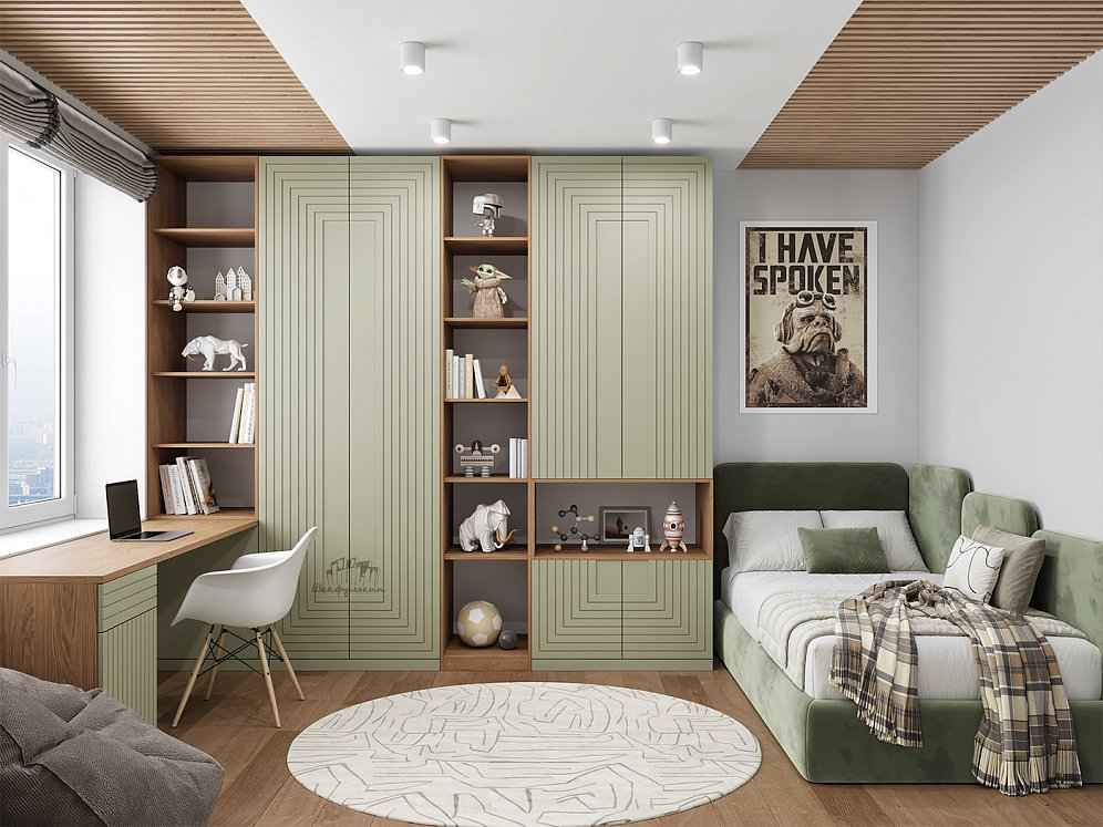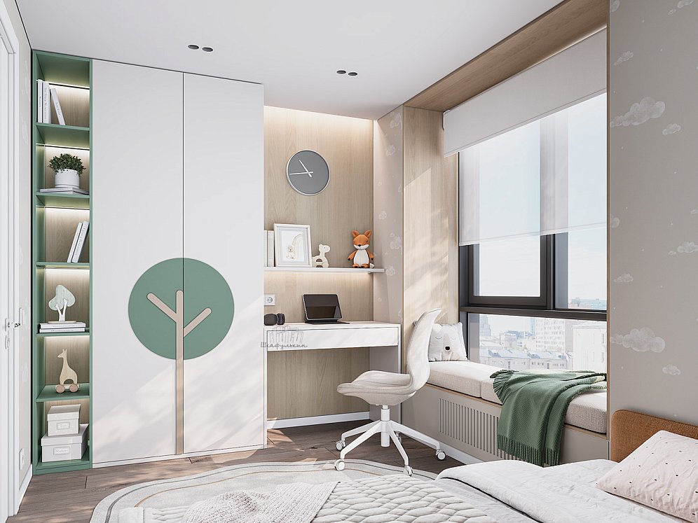 - Зелёный цвет ассоциируется с хорошим настроением, гармонией с природой и внутренним равновесием, что делает его идеальным для оформления детской.