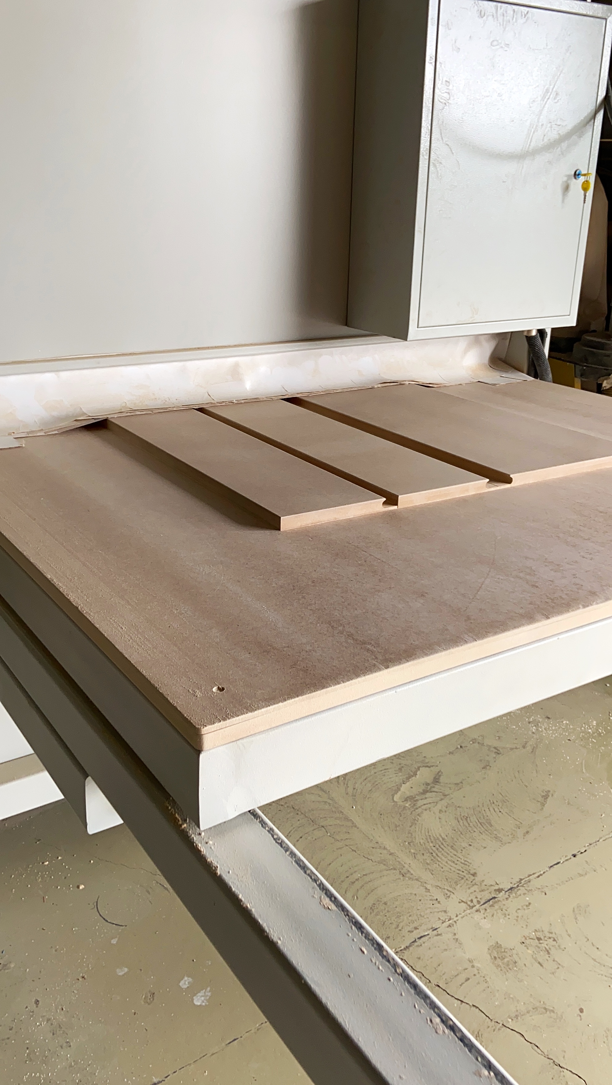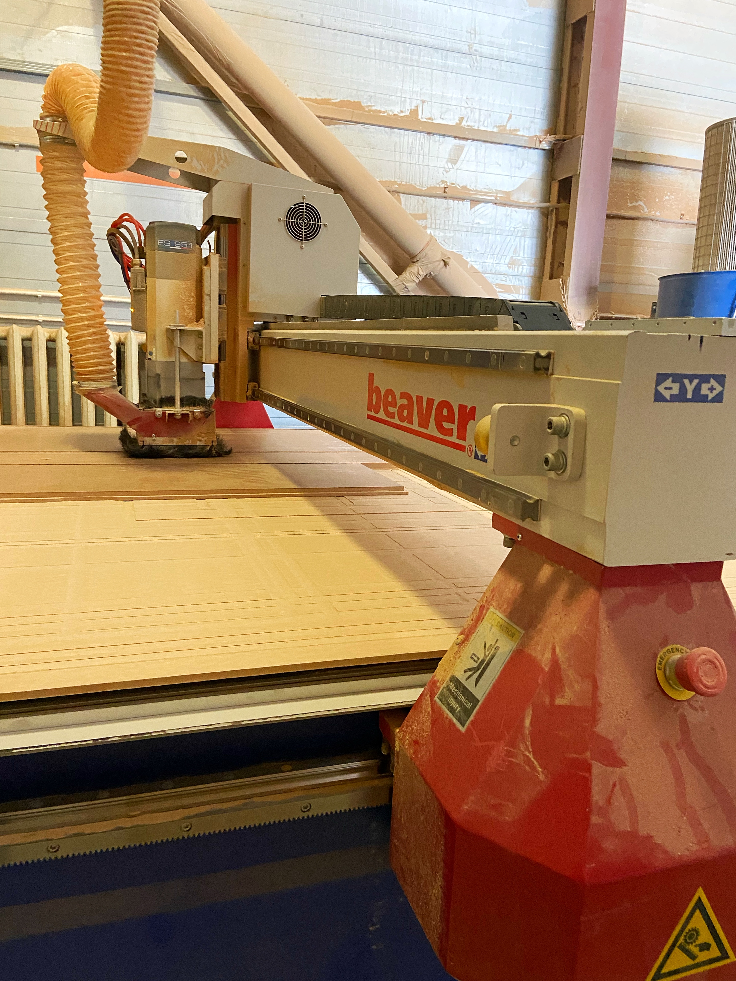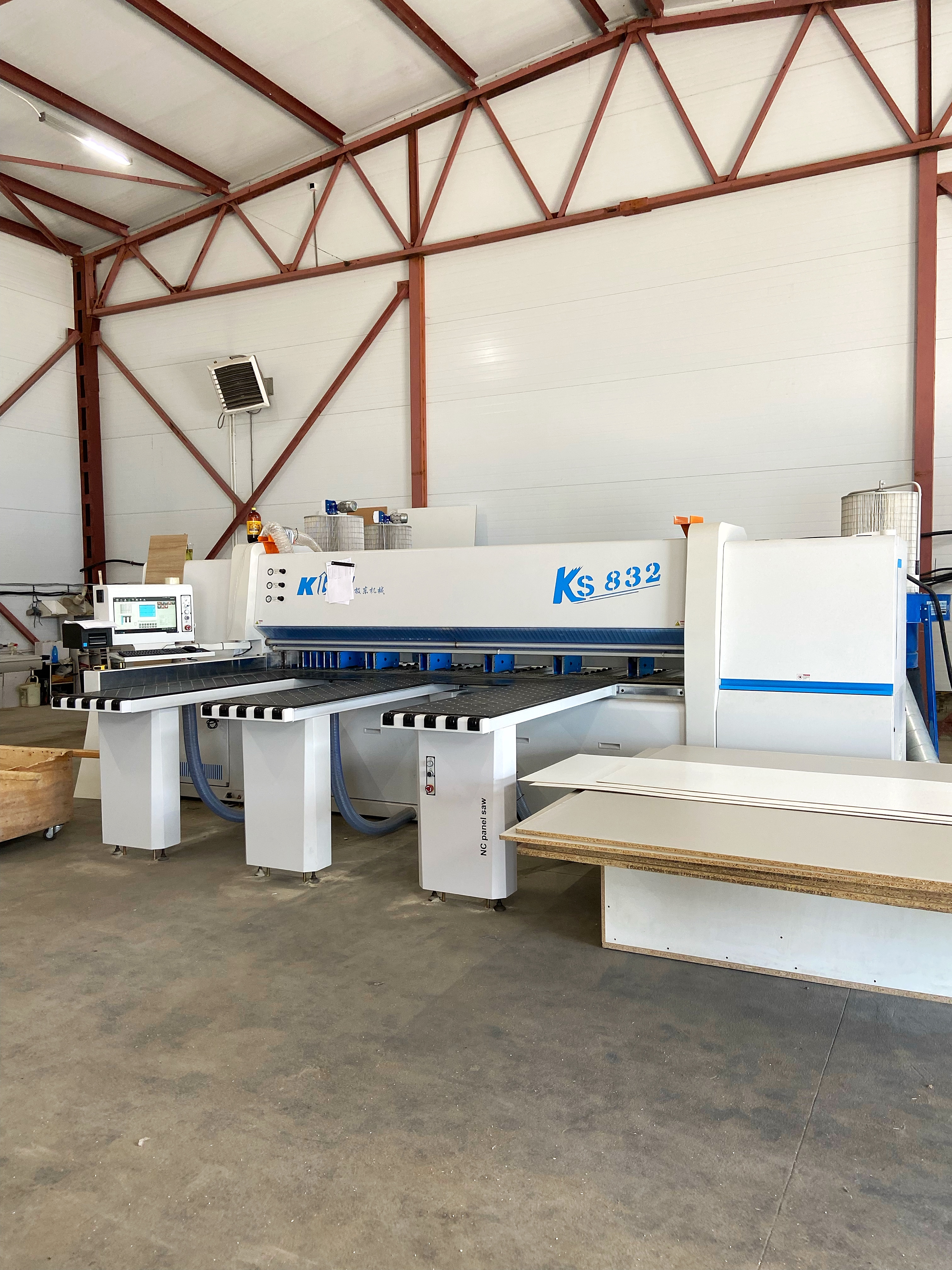 Первым делом осуществляется закупка материала. Плитные материалы привозятся в виде огромных стандартных листов, которые мы закупаем у компании EGGER. Из этих листов на форматно-раскроечном станке вырезаются детали будущей мебельной конструкции. С этой задачей у нас справляется форматно-раскроечный центр с ЧПУ KDT KS-832C. Данный станок отлично зарекомендовал себя на рынке. Он оснащен промышленным компьютером на базе Windows. Программируемый толкатель оборудован пневмозахватами, что гарантирует надежную фиксацию пакета заготовок. Восемь четырех пальцевых толкателей на 832C, надежно фиксируют как пакет материала толщиной до 90 мм, так и один лист. Специальная конструкция захватов не повреждает материал при его фиксации и перемещении.