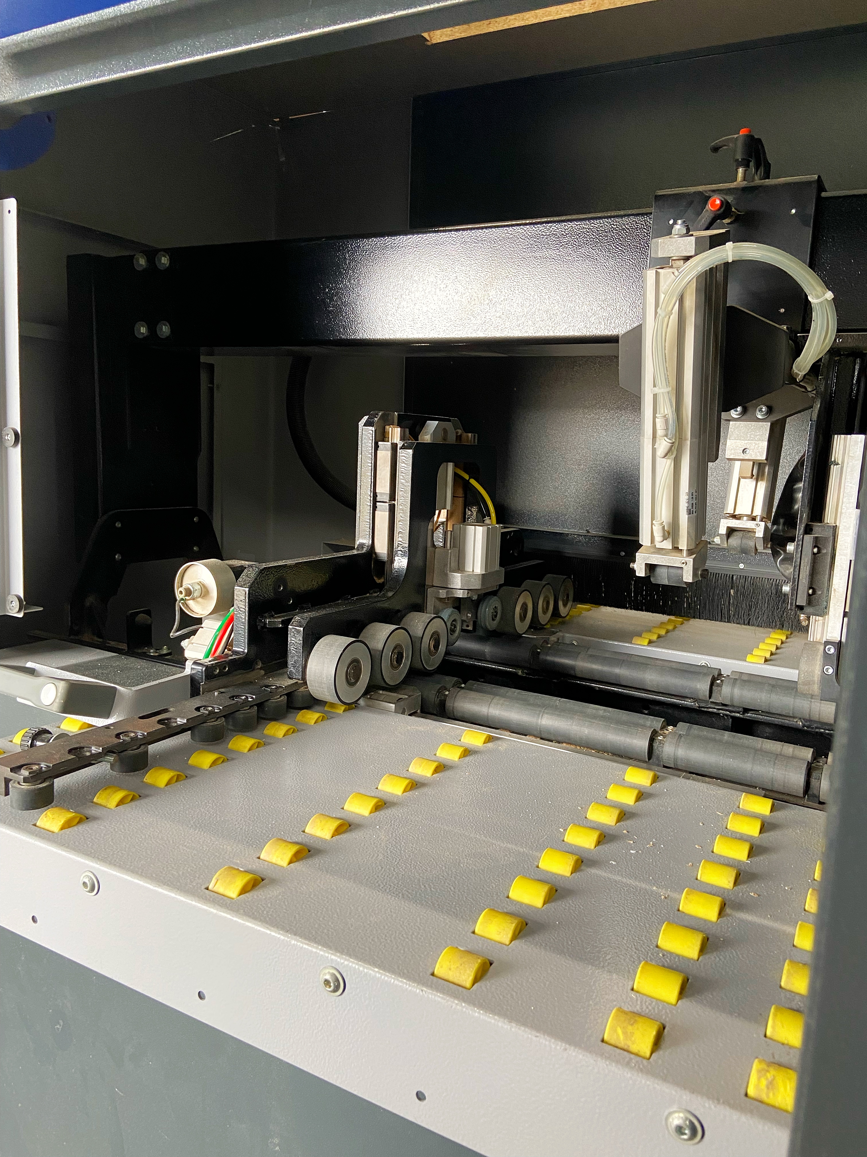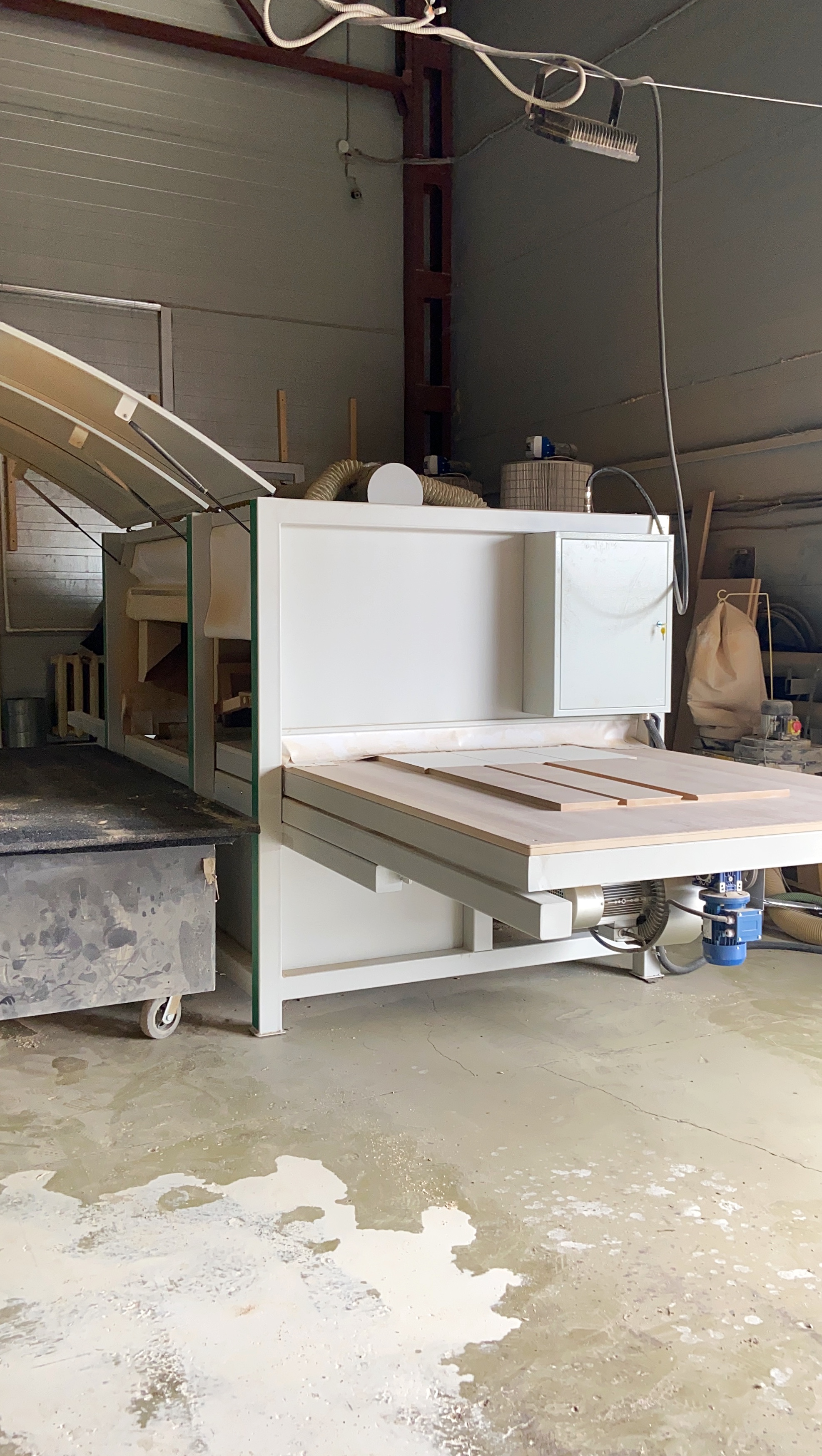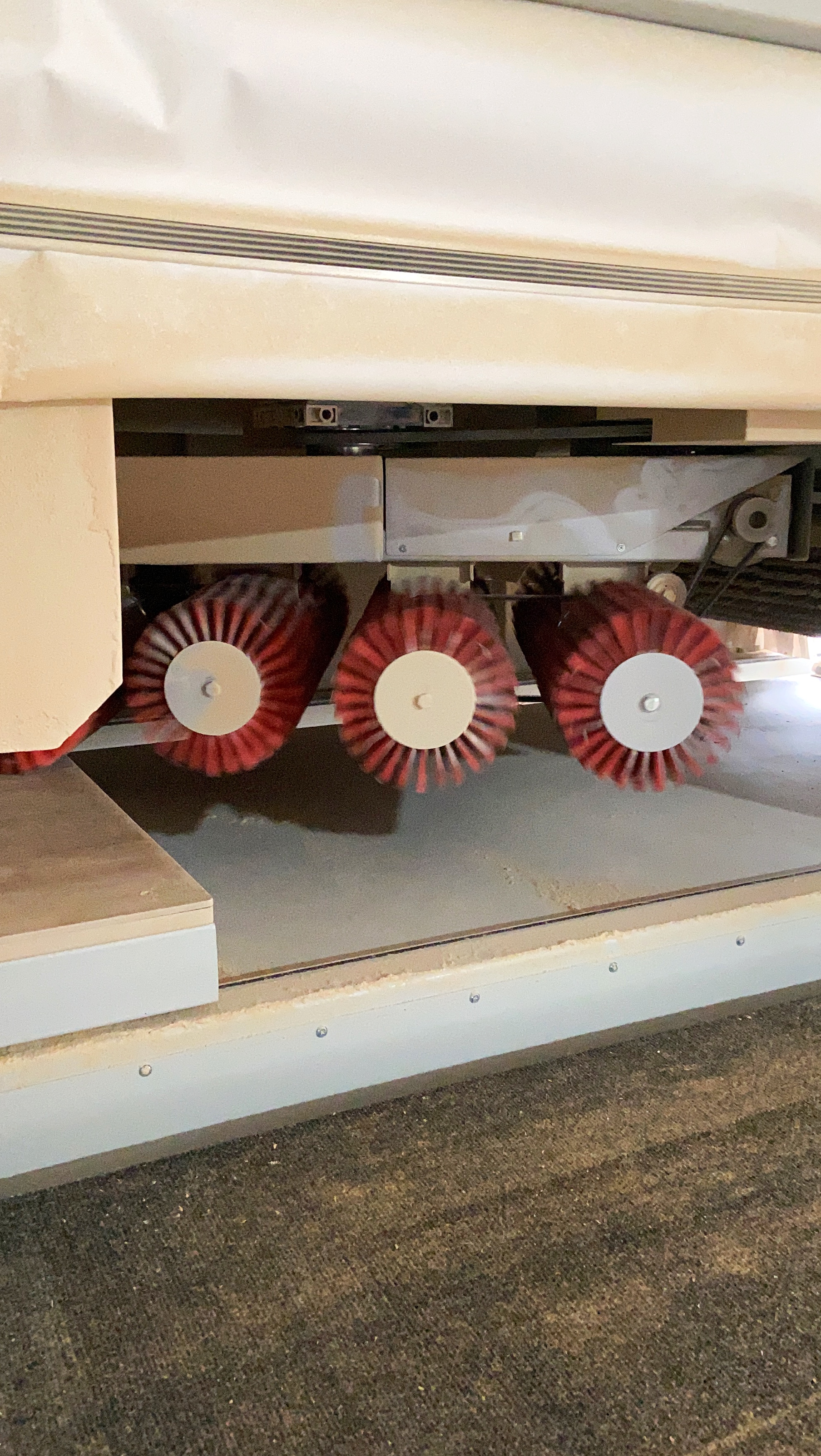 После завершения фрезеровки последним этапом, перед покраской, является шлифовка. На нашем производстве данную задачу выполняет шлифовальный станок модели SDA-1200. Станок предназначен для финишного шлифования необработанной или грунтованной поверхности изделий. Он оснащен комплектом спаренных блоков шлифовальных валов с вращением барабанов вокруг своей оси и с орбитальным вращением всего комплекта (карусели), что позволяет получать высокое качество обработки поверхности. Скорость подачи заготовок регулируется плавно с помощью инвертора для обеспечения оптимального выбора режимов обработки в зависимости от вида обрабатываемых изделий, заданной чистоты обработки.