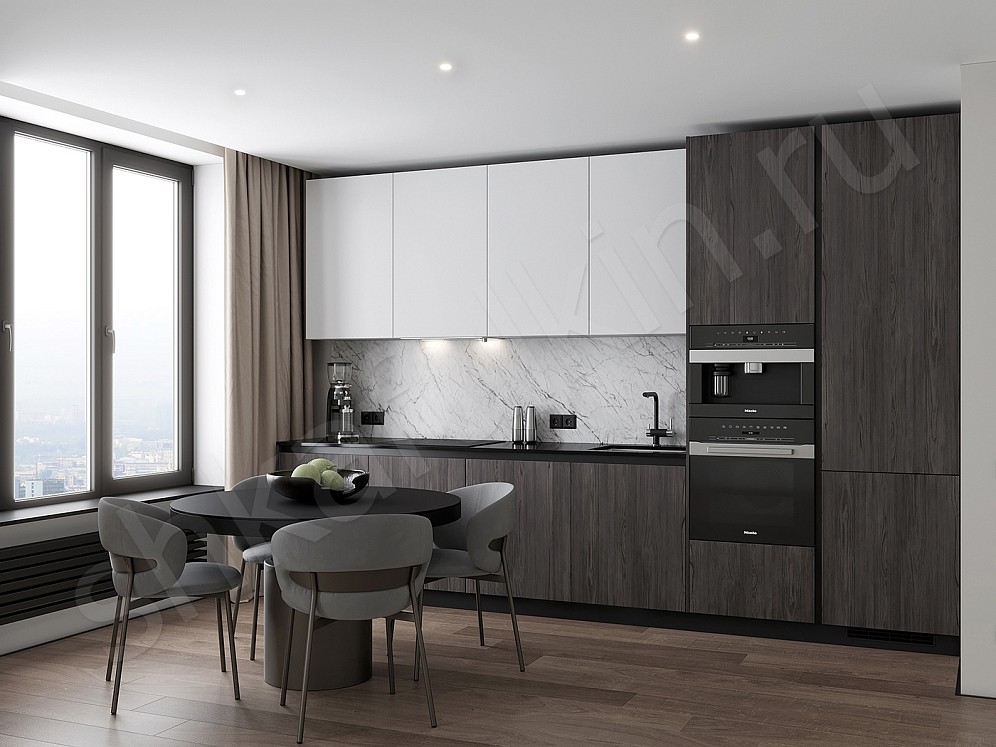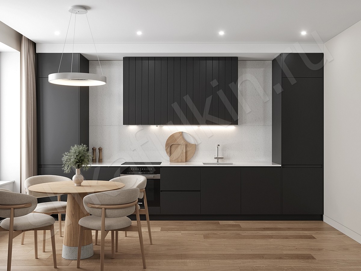 Среди современных трендов дизайна прямых кухонь встречаются мебель в чёрном, сером или тёмно-коричневом цвете. Эти оттенки придают интерьеру стильный и современный вид. Однако, следует учитывать, что такая кухня лучше всего смотрится в просторных помещениях. В небольших комнатах она может создать ощущение перегруженности, визуально уменьшая пространство.