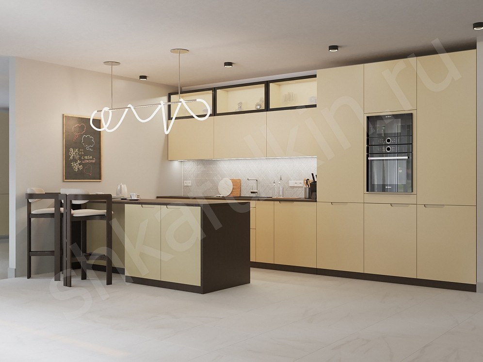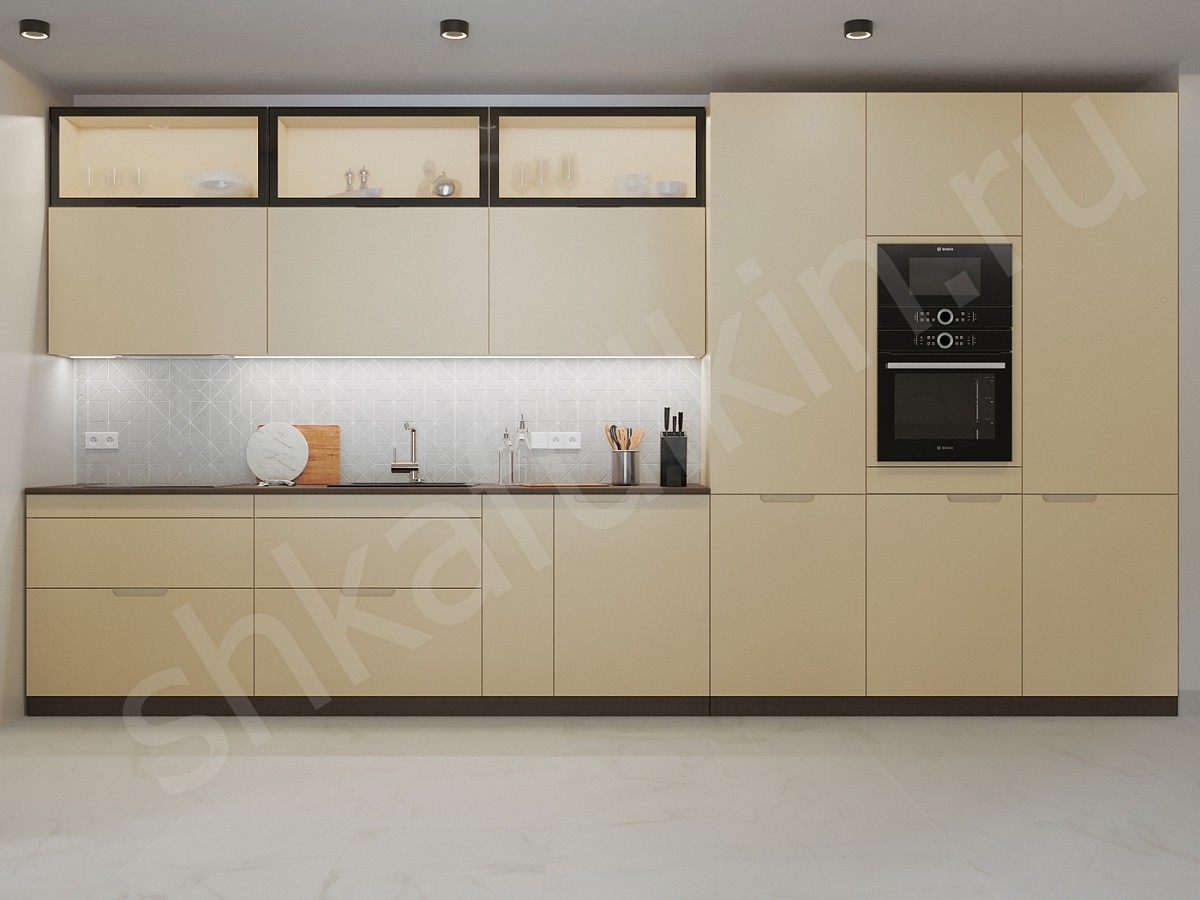 - Для длинной кухни рекомендуется заказать высокие шкафы, в которых можно удобно разместить холодильник, микроволновку, духовку. Это позволит сделать помещение более гармоничным и эффективно использовать доступное пространство.