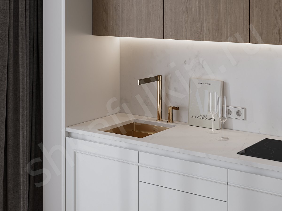 - Разместите мойку посередине для удобства и избегания "столкновений" со стеной. Если подводка для воды находится в углу и её нельзя переместить, выберите тумбу для мойки шириной не менее 80 см. – это обеспечит комфортное использование.
