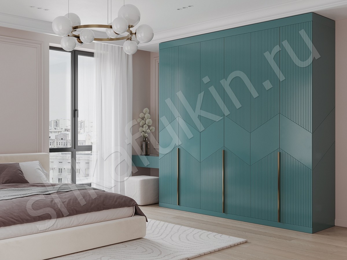 Если же есть желание добавить некоторый акцент к дизайну спальни, то можно рассмотреть варианты цветных фасадов, либо выбрать шкаф нестандартной формы.