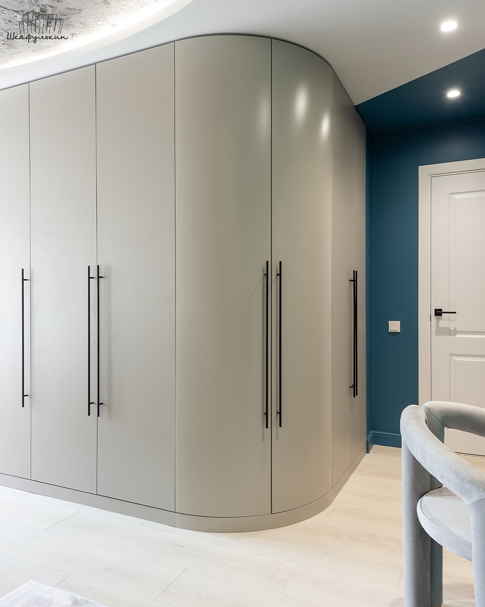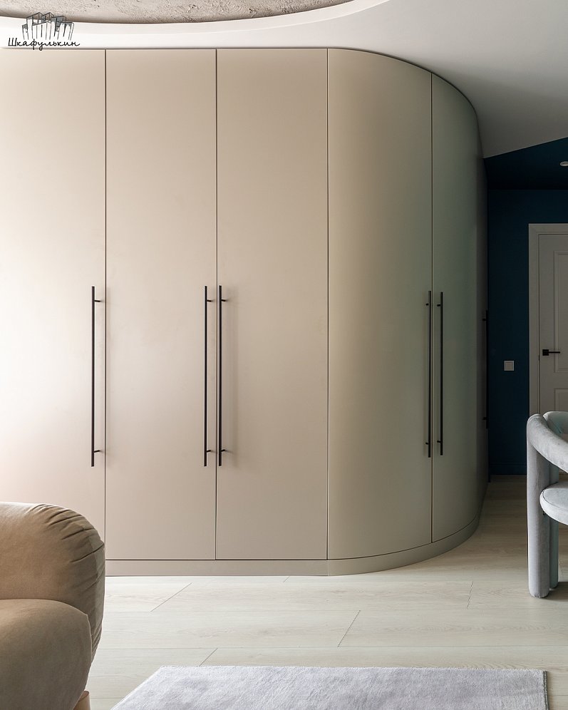 Центральный фасад специально сделали таким для обеспечения проходимости, во избежание потери эргономичности от угла. Шкаф в данном случае выполняет функцию не только удобной системы хранения, но и зонирования пространства.