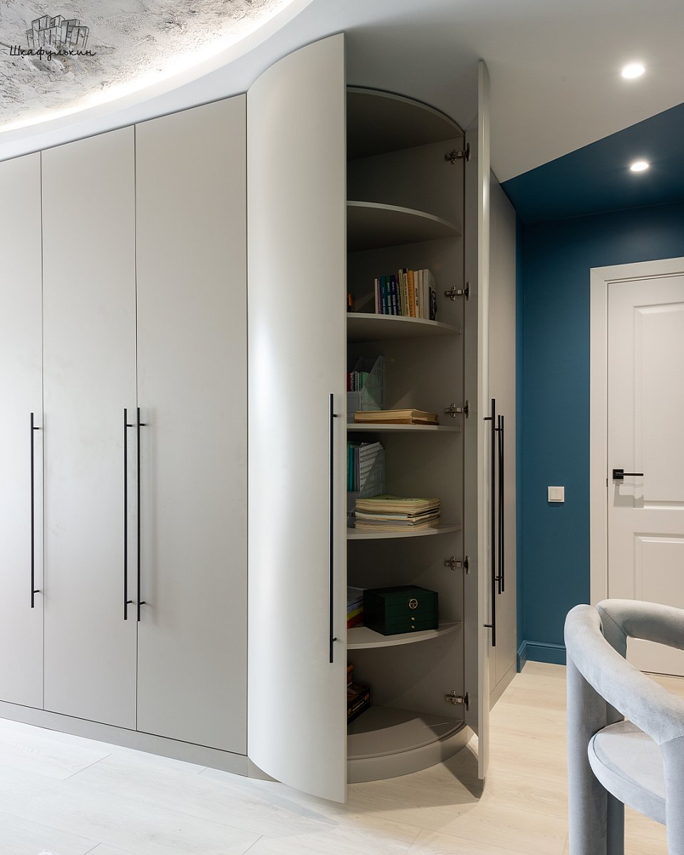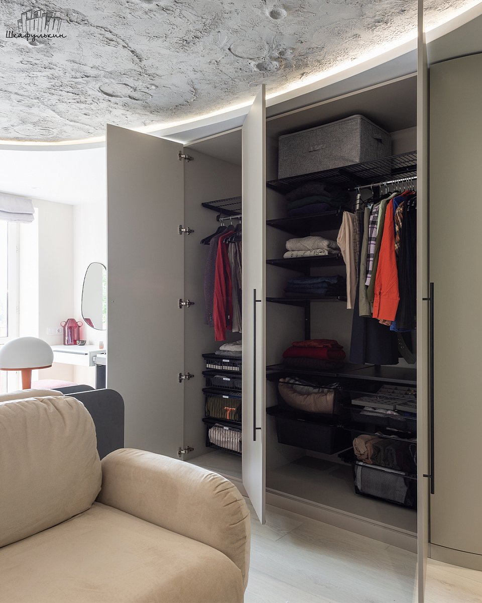 На место скромной вешалки для одежды встал большой и вместительный шкаф с фасадами EGGER цвета Серая галька. Его высота в 2 метра идеально подходит для высоких молодых людей, обеспечивая удобный доступ к верхним полкам. Но, конечно, первой на глаза бросается необычная изогнутая форма.