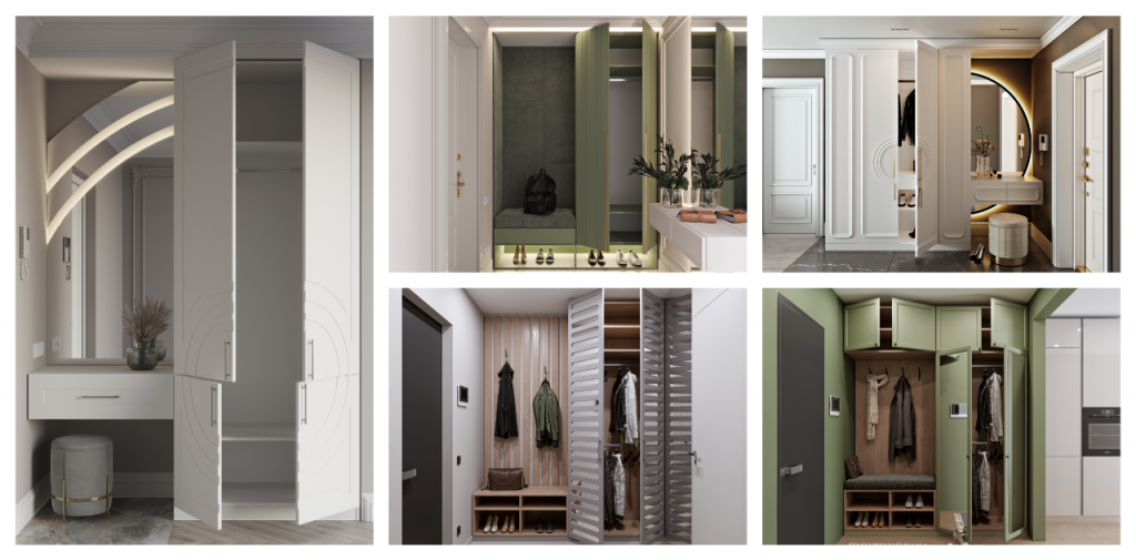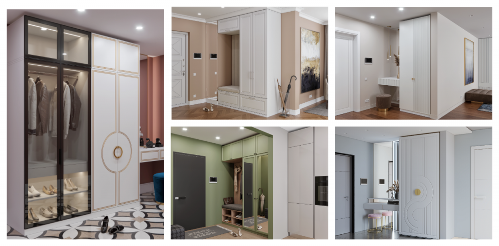 6. В узкую прихожую лучше установить шкаф светлых оттенков, так он будет выглядеть гораздо легче. Также можно на фасады установить зеркала, так вы визуально увеличите пространство помещения. Кроме того, зеркало в прихожей упростит ваши сборы.