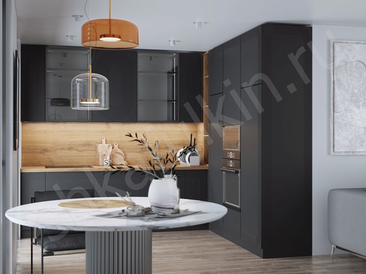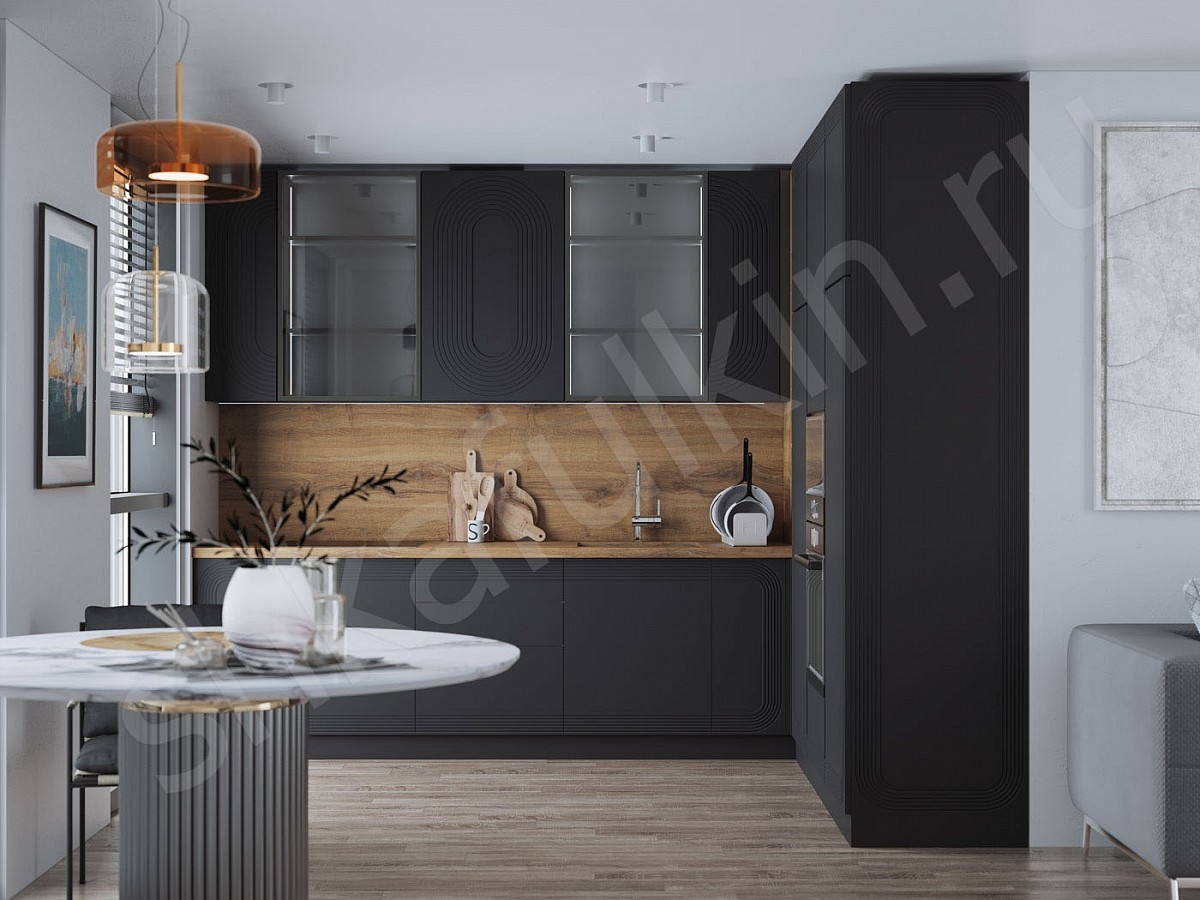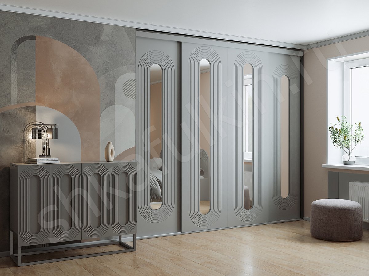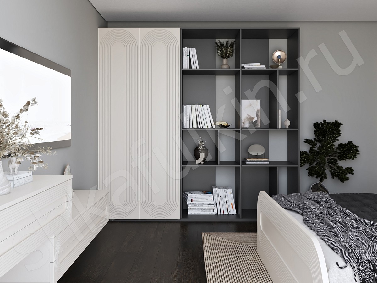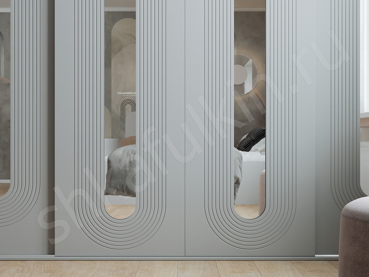 Отличительная черта – все изделия объединены одной фрезеровкой фасада. Рисунок фрезеровки объединяет всю мебель в коллекцию и сквозной нитью создает единство в дизайне квартиры.