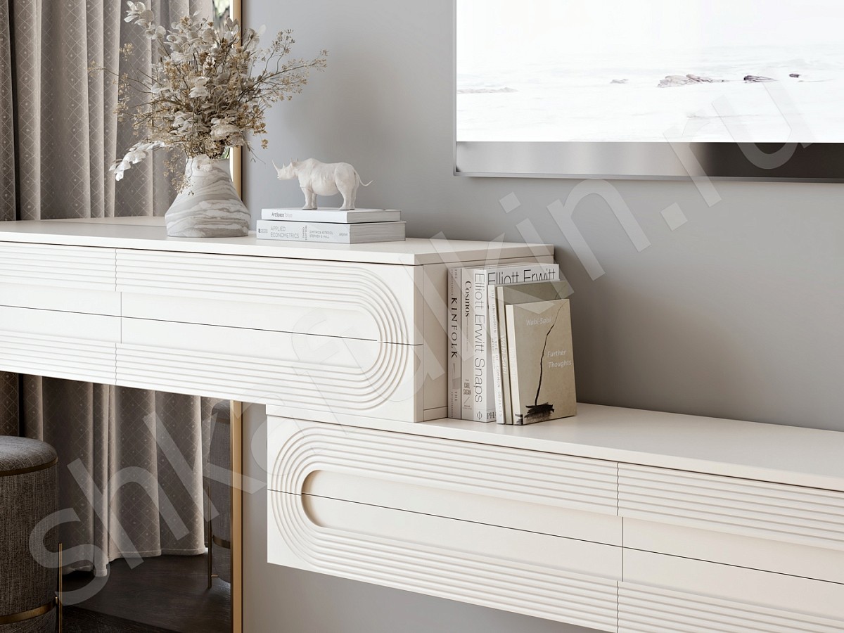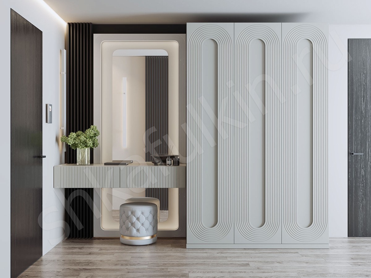 Коллекция мебельных изделий включает в себя: кухонный гарнитур, шкаф-купе, распашные шкафы, тумбы, комоды, консоли, навесной туалетный столик.