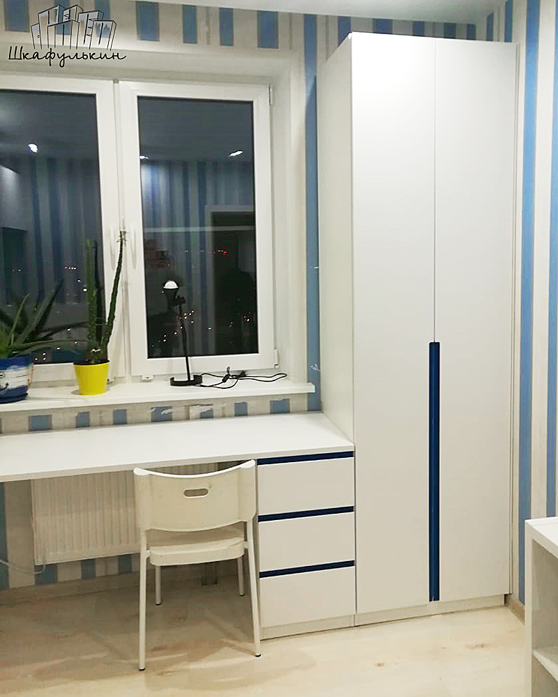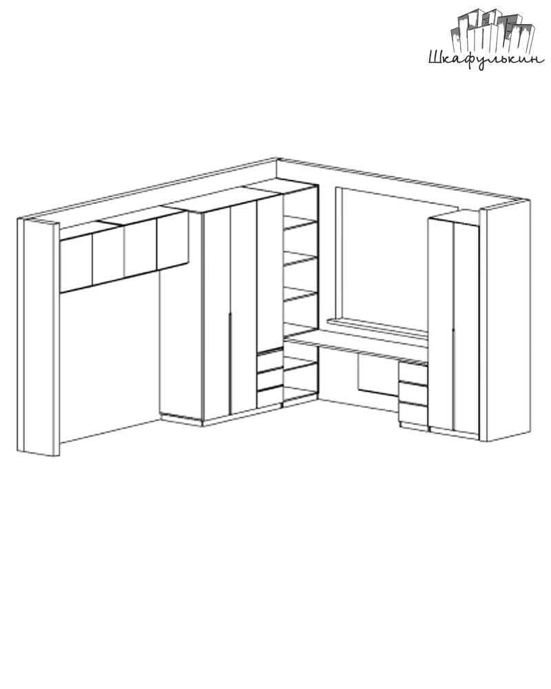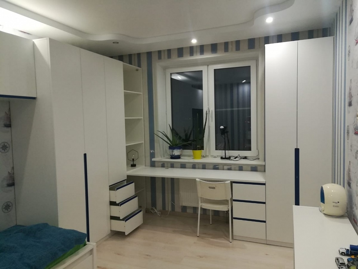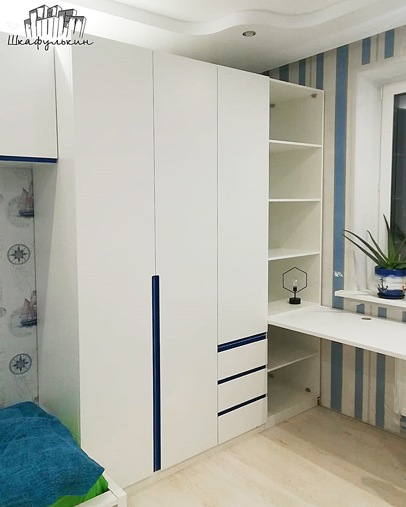 Детская Доминик – это секция для хранения над кроватью, удобная рабочая зона со столом и вместительными шкафами.