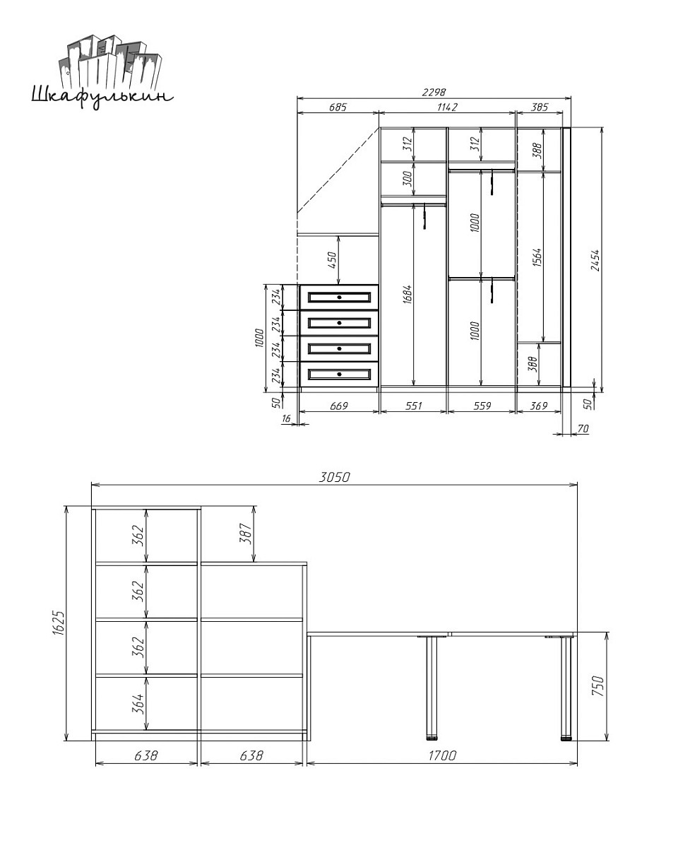Габаритные размеры стола со стеллажом: 3050х1625х350-450 мм.